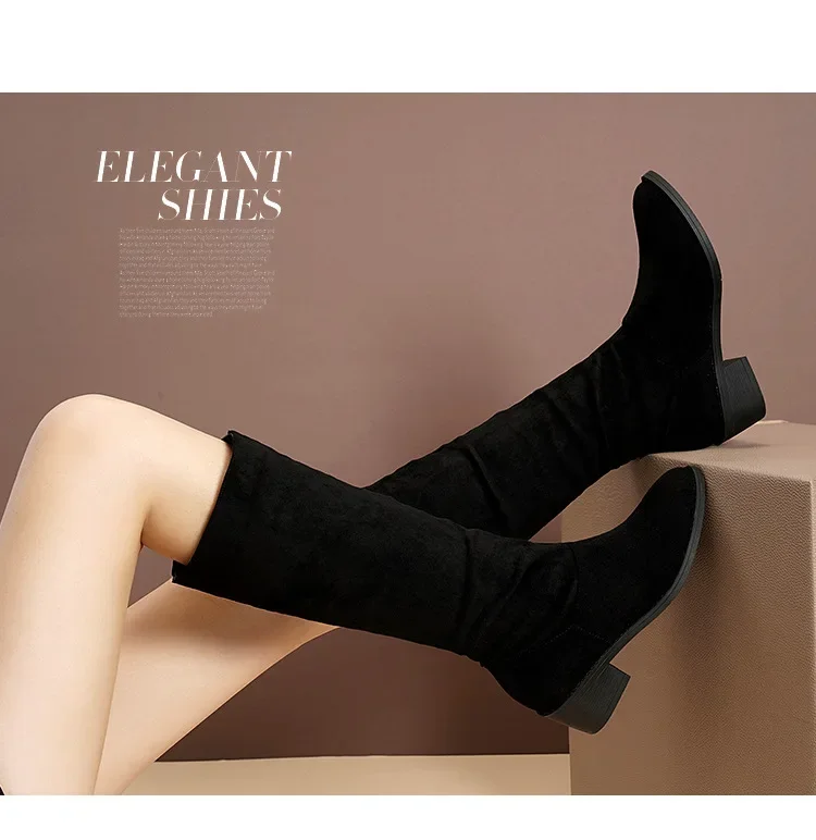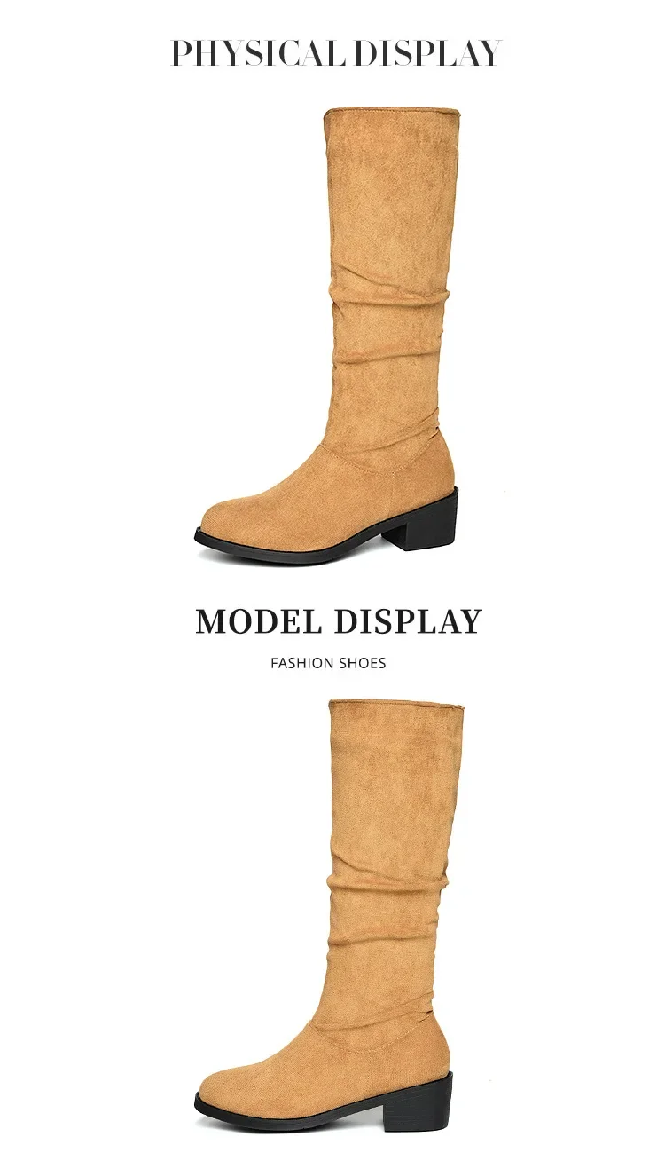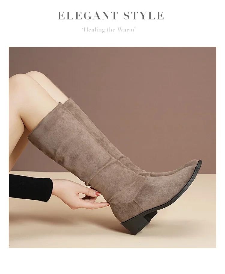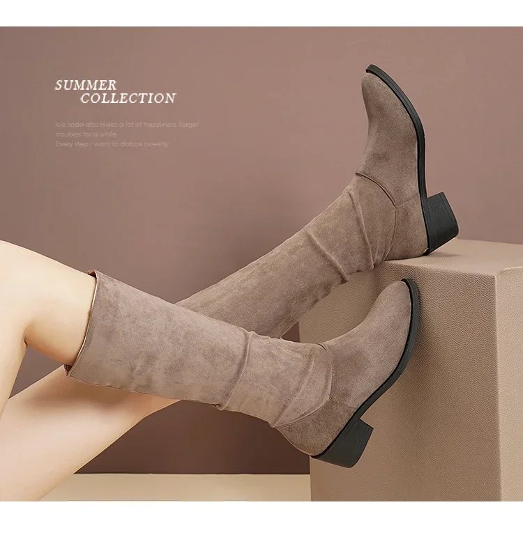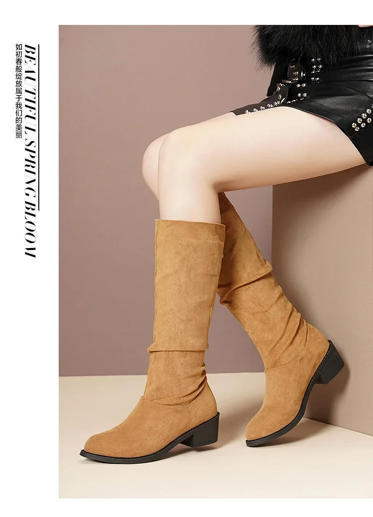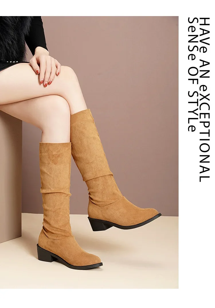 Pointed Toe Pleated Boots Women Black Nude Faux Suede Flock Knee High Boots Ladies Low Chunky Heel Cowboy Boots Plus Size 2024
