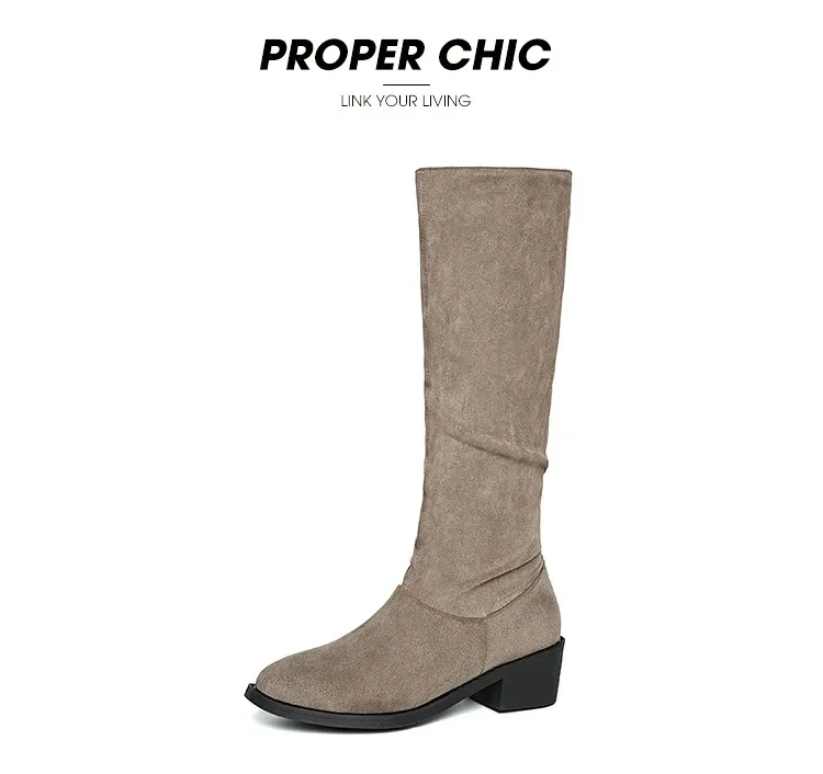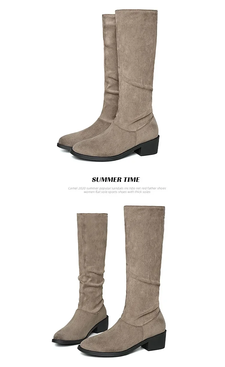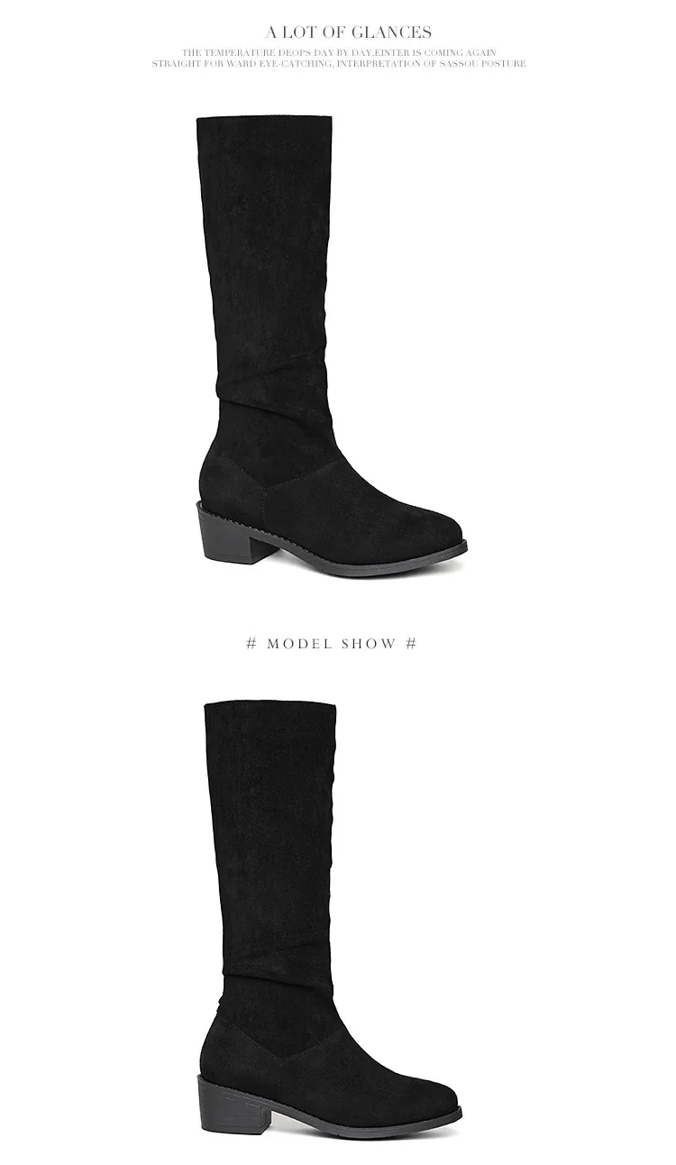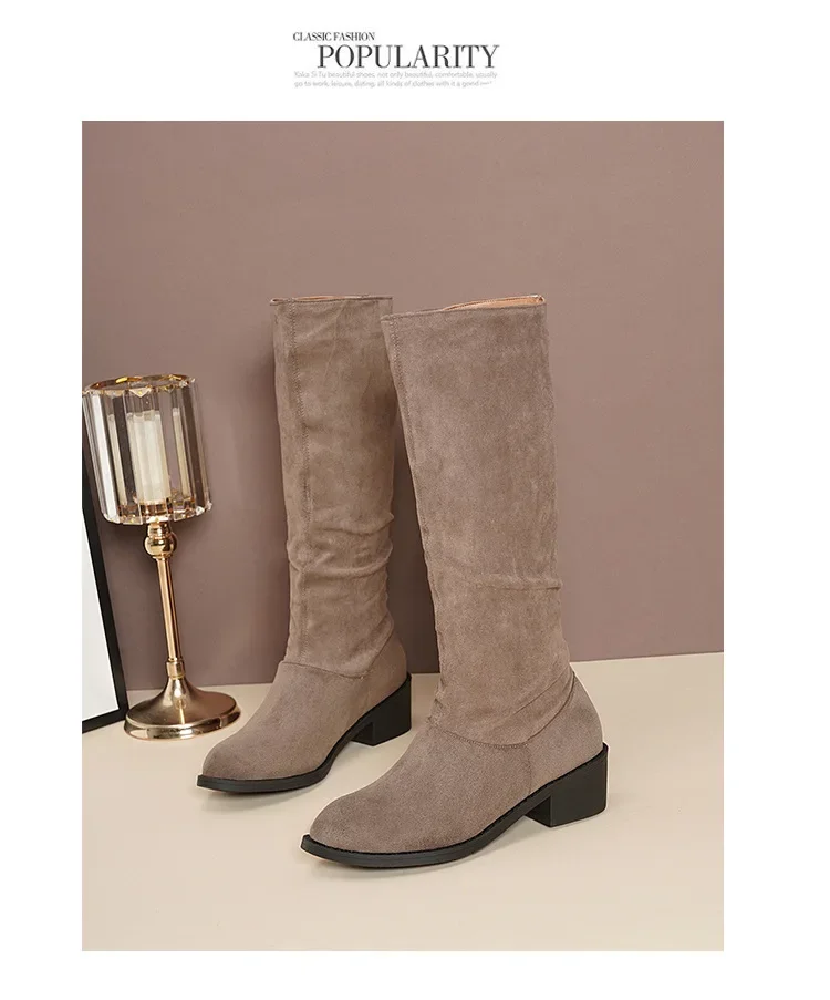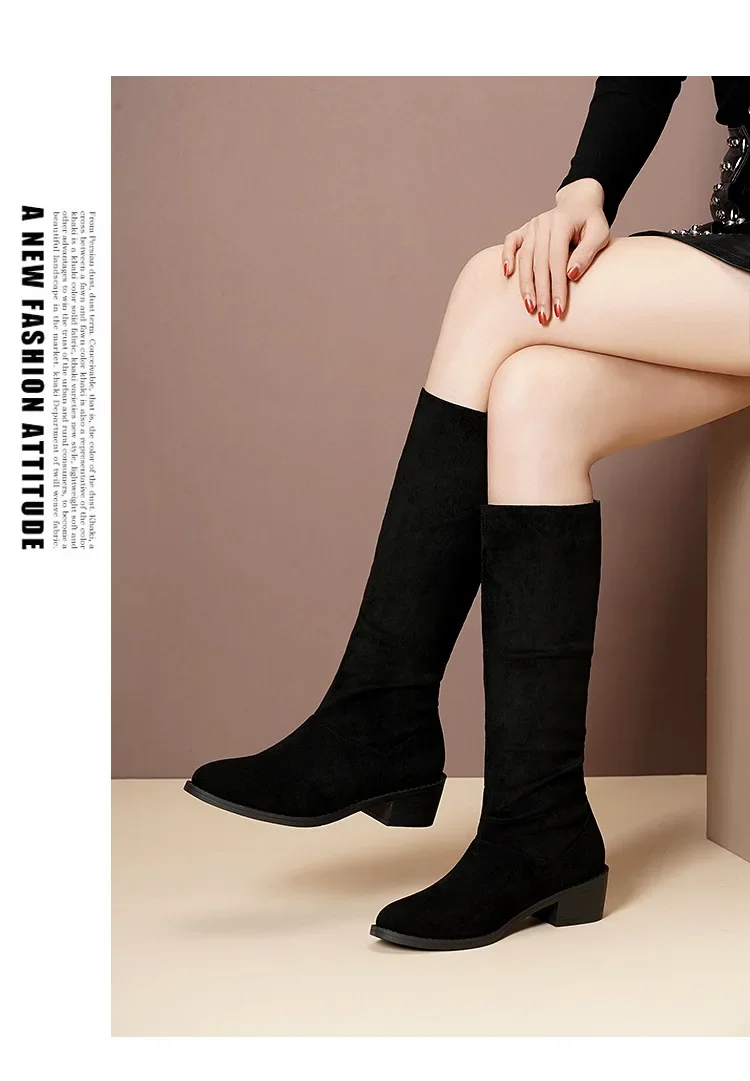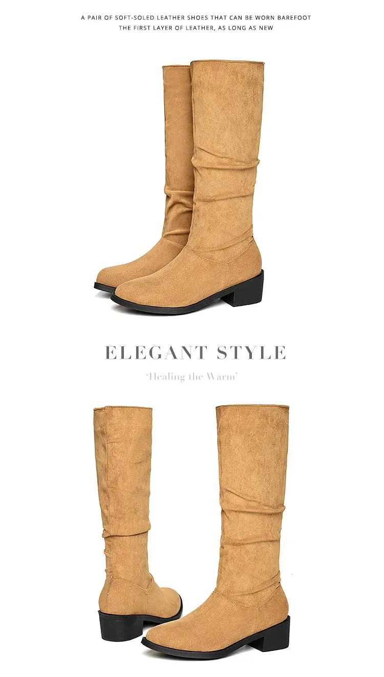 Pointed Toe Pleated Boots Women Black Nude Faux Suede Flock Knee High Boots Ladies Low Chunky Heel Cowboy Boots Plus Size 2024