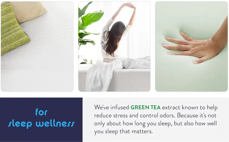 Comfort Top Layers Green Tea Memory Foam, Pressure Relief Foam Microfiber Quilted Cover, High Density Foam Gel Memory Foam, Ventilated Pressure Relief Foam Gel Memory Foam, Ventilated Pressure Relief Foam Microfiber Quilted Cover, High Density Foam Microfiber Quilted Cover, Pressure Relief Foam, High Density Foam