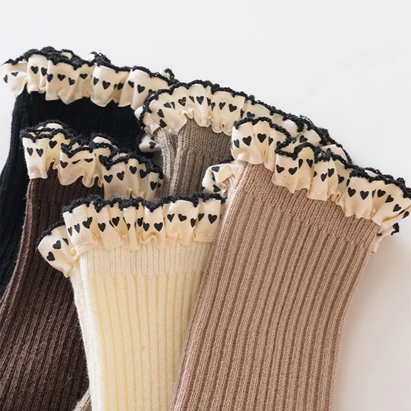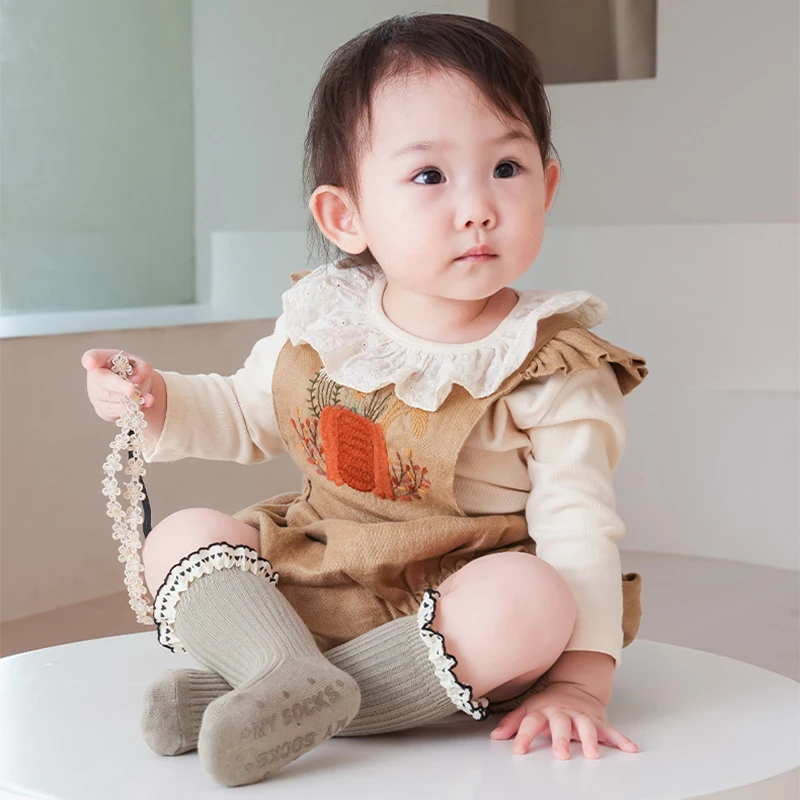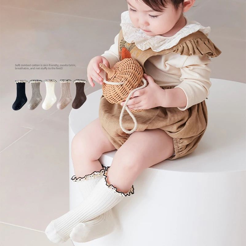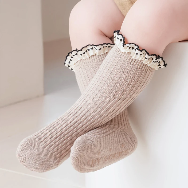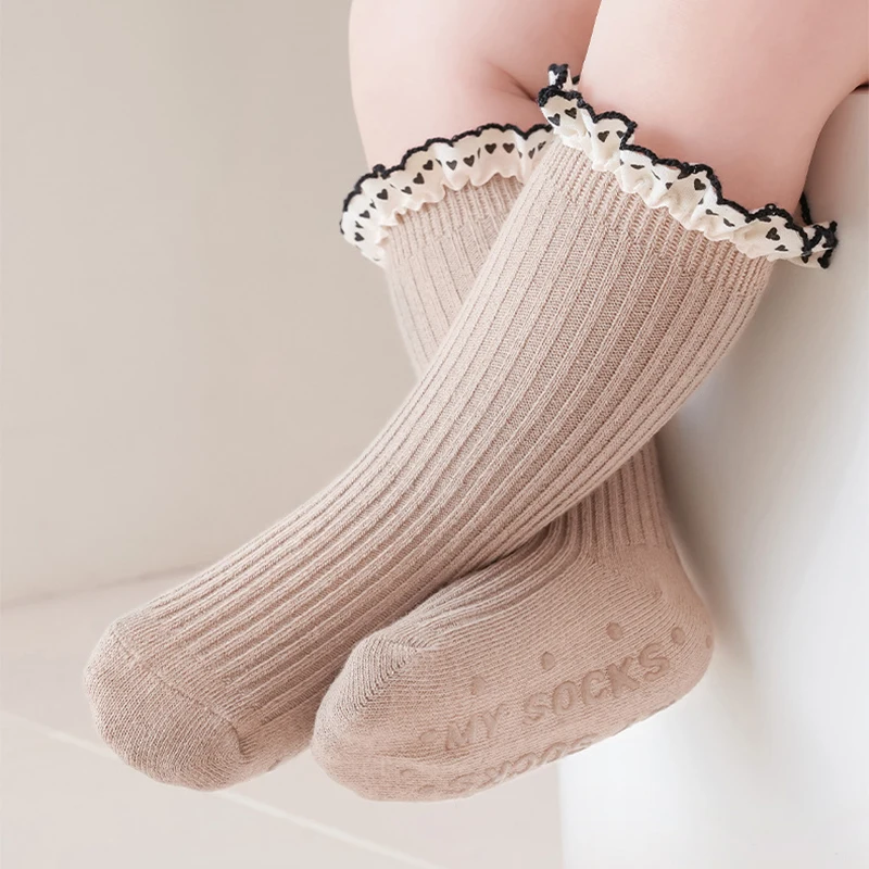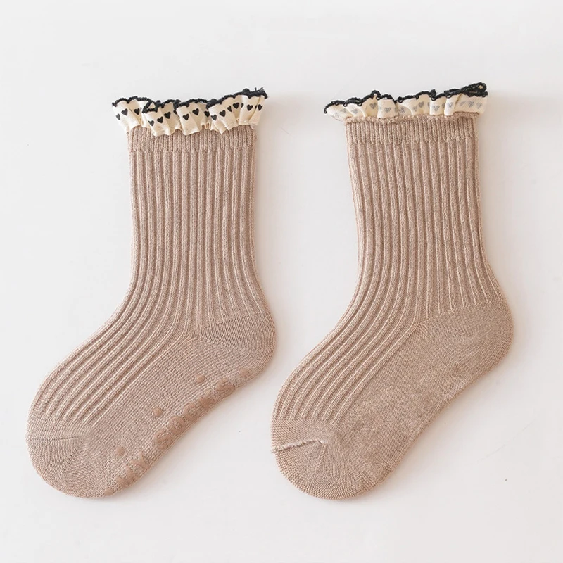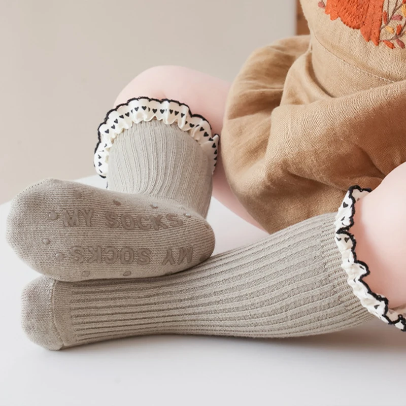 Princess Girl Lace Ruffle Socks Baby Autumn Warm Kint Sock Kids Solid Color Cotton Socks Silicone Bottom Anti Slip Floor Socks