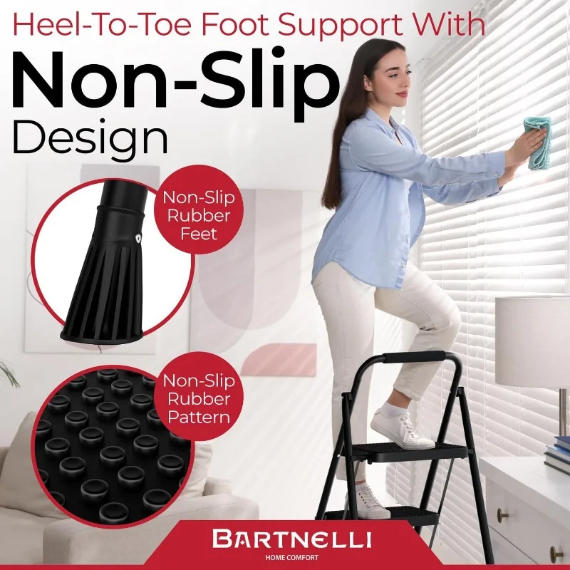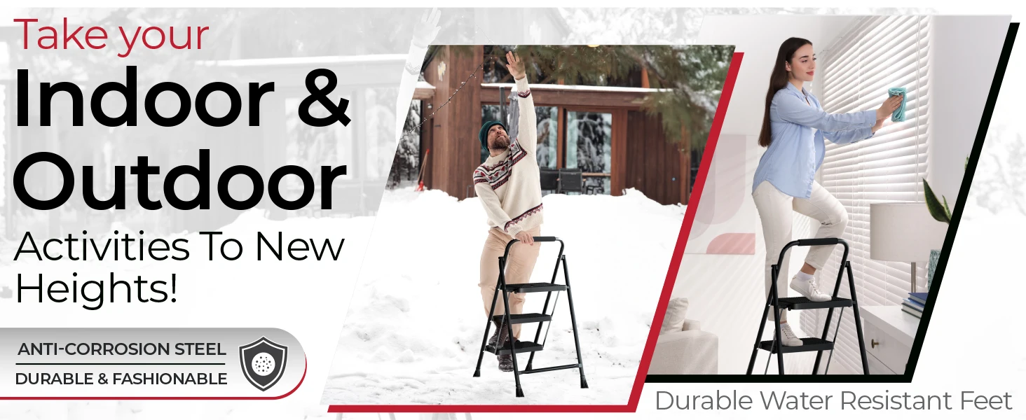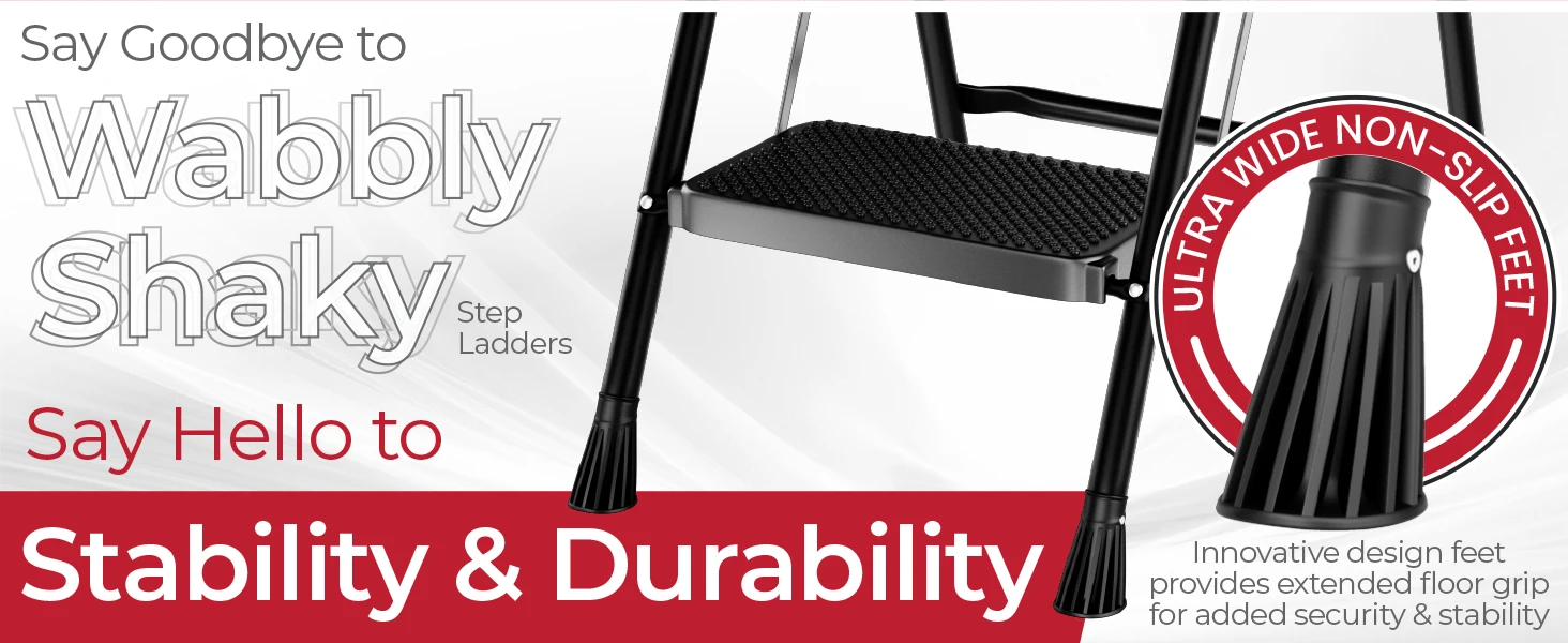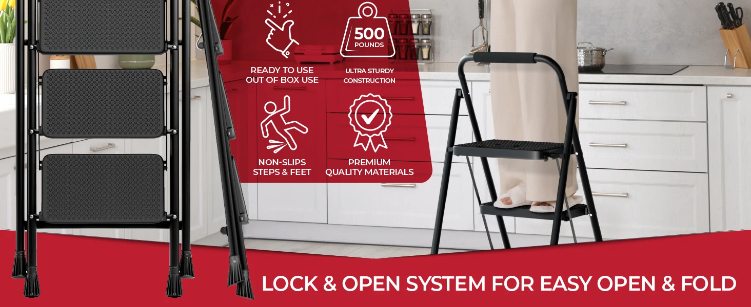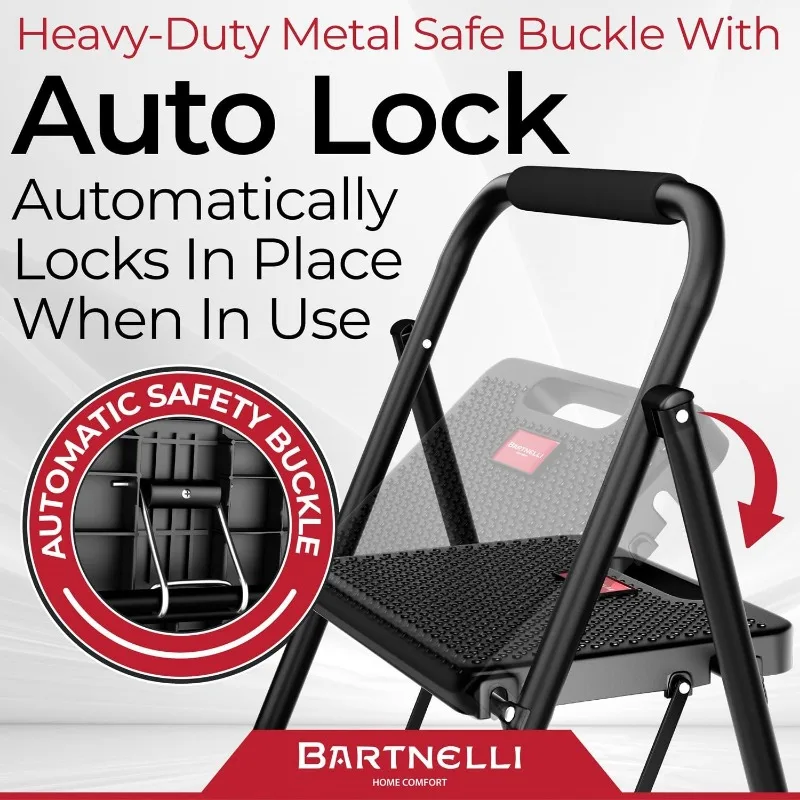 ENHANCED SECURITY WITH STURDY CONSTRUCTION – Featuring a high-grade steel frame and a metal-safe buckle that locks automatically, this step ladder ensures every climb is secure, meaning peace of mind for you and your loved ones during use.