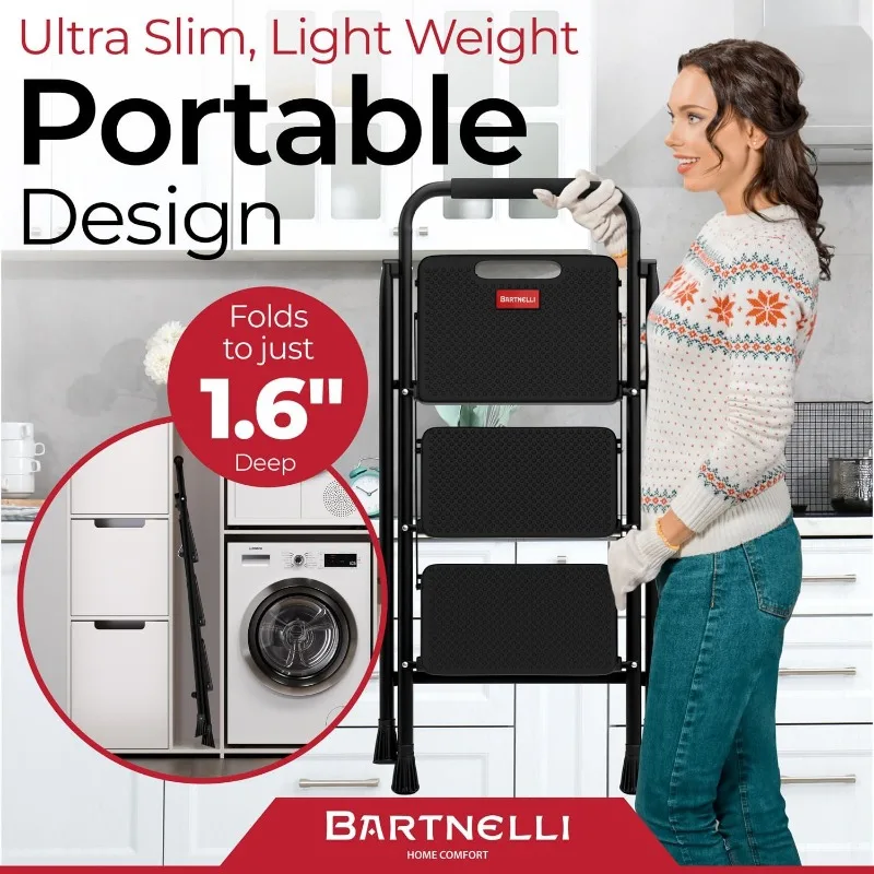 FOLDABLE STEP STOOL FOR EFFICIENT STORAGE – This step stool effortlessly collapses to just 1.6" D, so you can maximize your space without giving up on functionality, translating to a clutter-free home while maintaining accessibility.