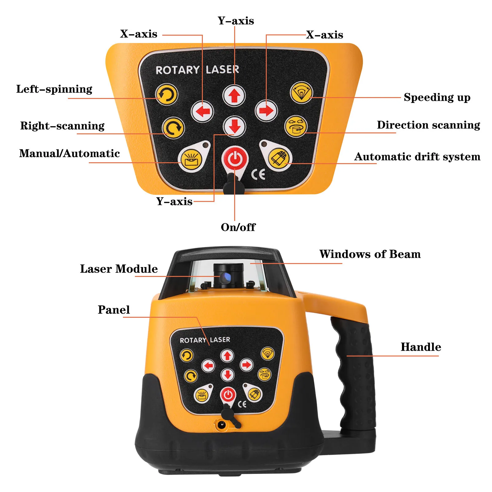 This laser leveling machine will cast a 635nm red visible laser beam to level positioning of the laser beam height. It has a 500m working distance and 360°rotatable function with the clear, bright and stable lines. With 5 degree self levelling-range and 500m diameter measurement-range. Two working modes design, spinning direction adjustable, speed adjustable, angle adjustable, and all functions can be used with remote controller.