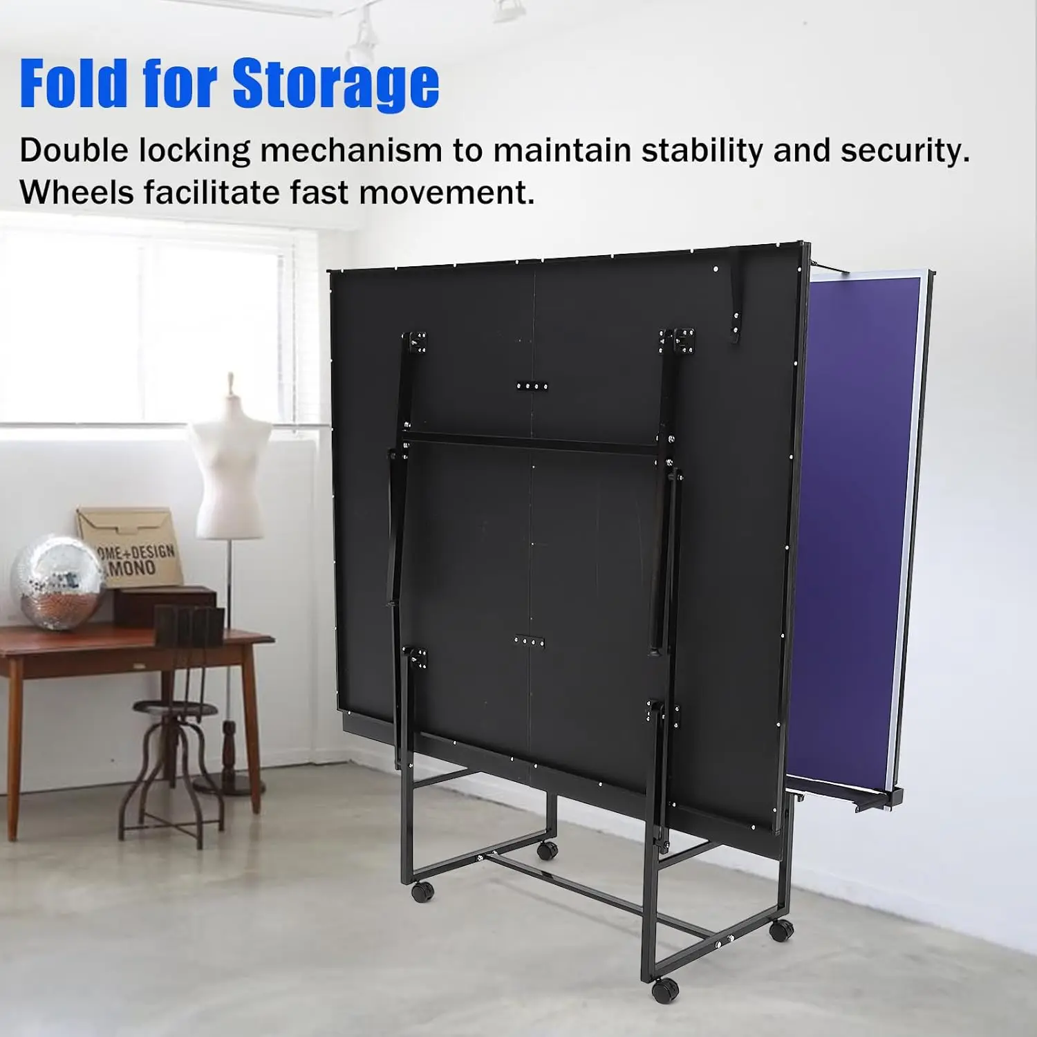 【COMPACT STORAGE】Our table tennis table features a foldable design on each half with a double locking mechanism for effortless storage. Equipped with wheels at the bottom (8ft/9ft), it can be easily moved and securely locked into the storage place or playing field.
