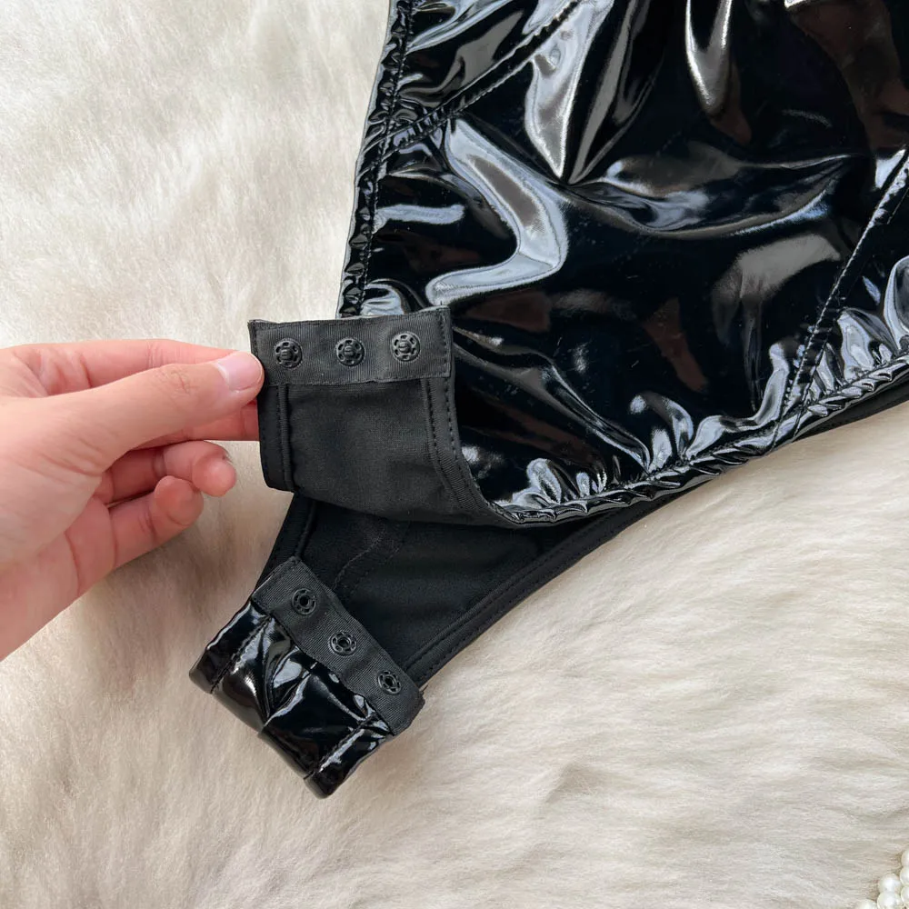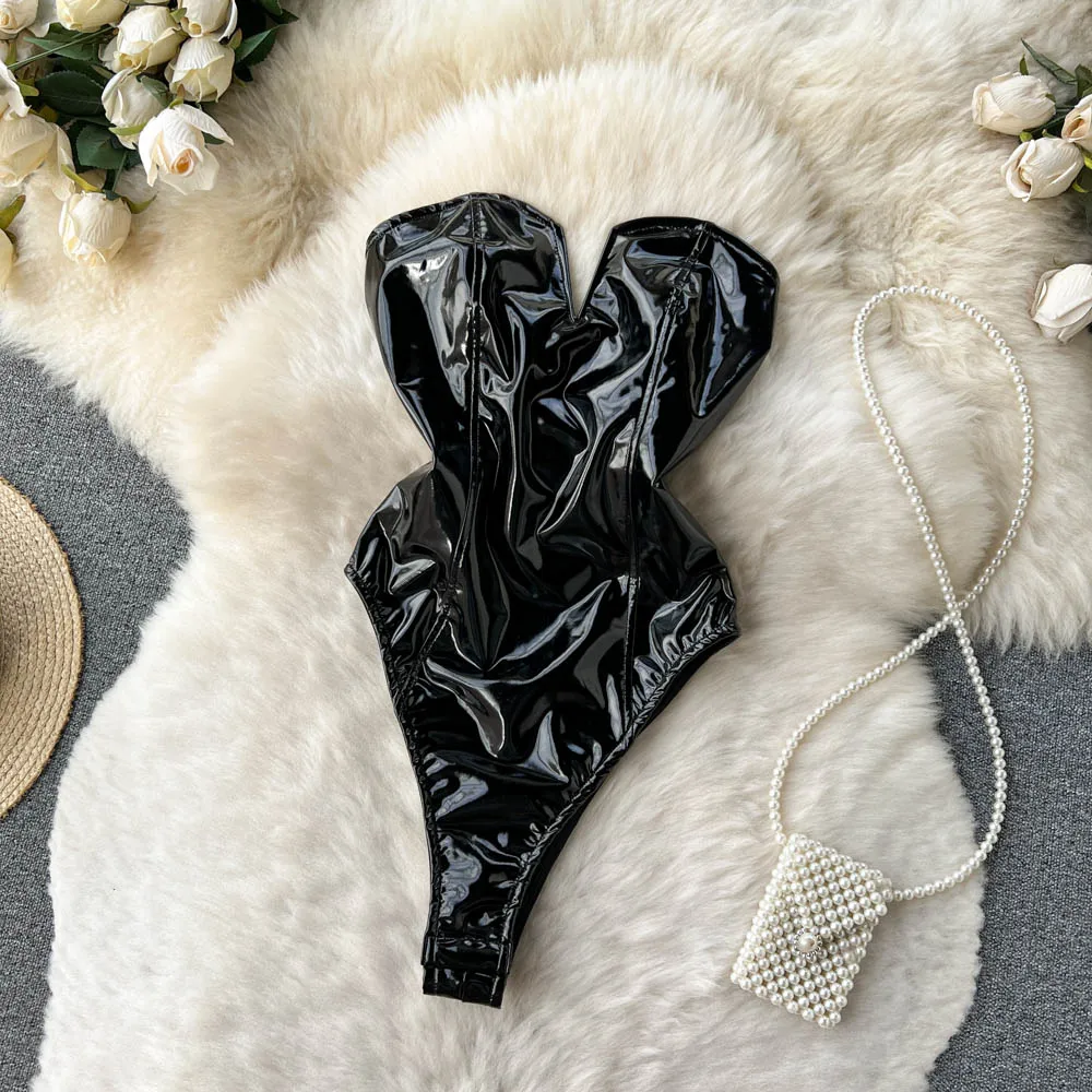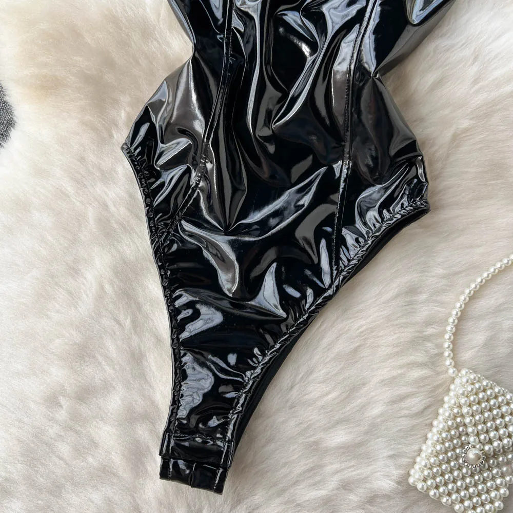 PU Leather Sexy Bodysuits Women Sleeveless Zipper Slim Rompers Autumn Winter Streetwear French Style Holidy Vintage Palysuits