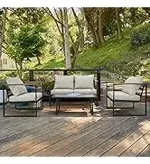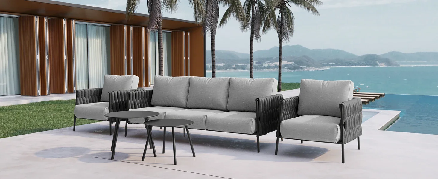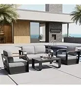 EAST OAK Life Chatter Patio Furniture Set 5 Pieces, Outdoor Furniture 5-Seat Sofa with Two Round Coffee Table, Waterproof Thick Cushion Deep Seating for Porch, Balcony, Earth Black & Misty Grey
