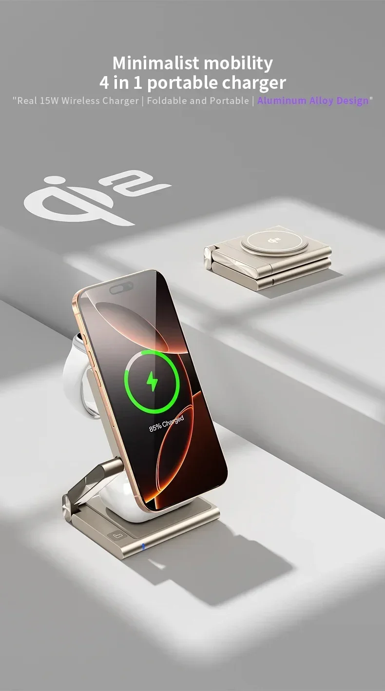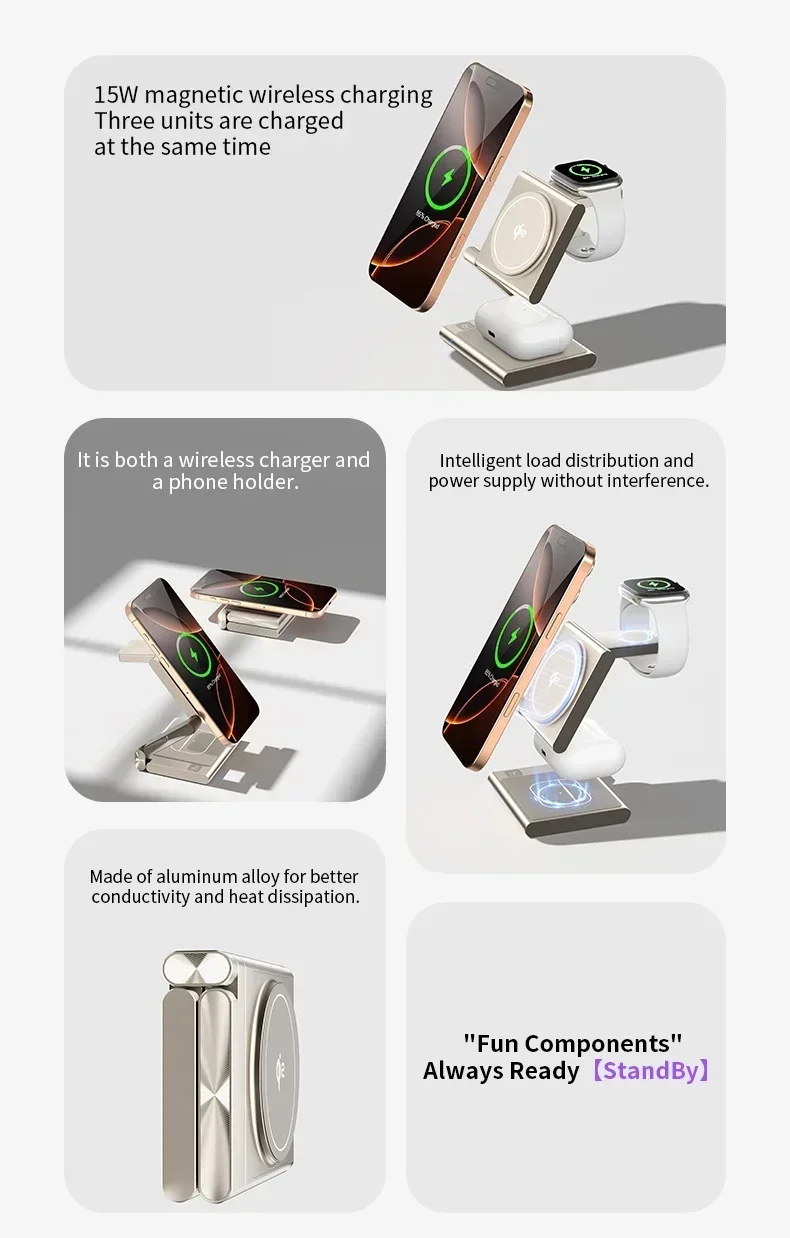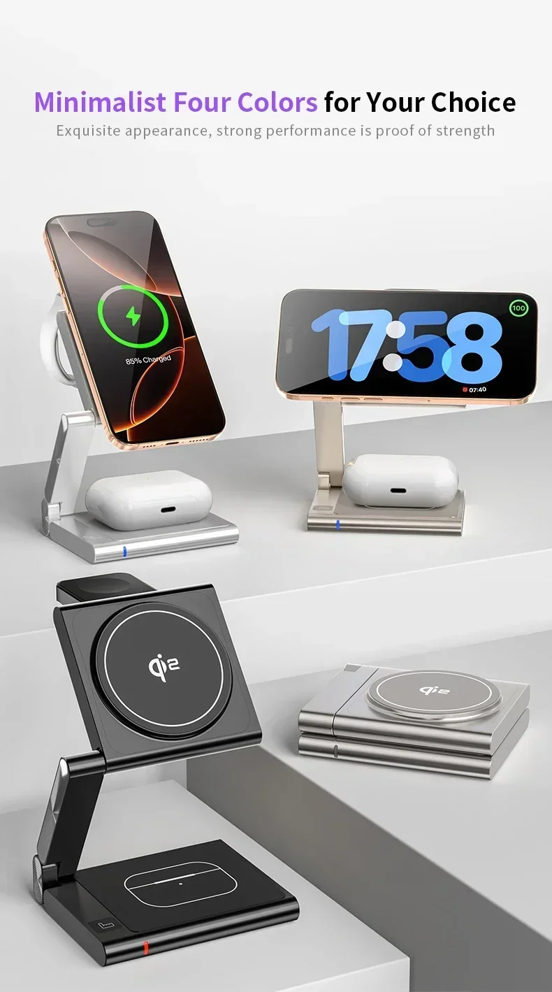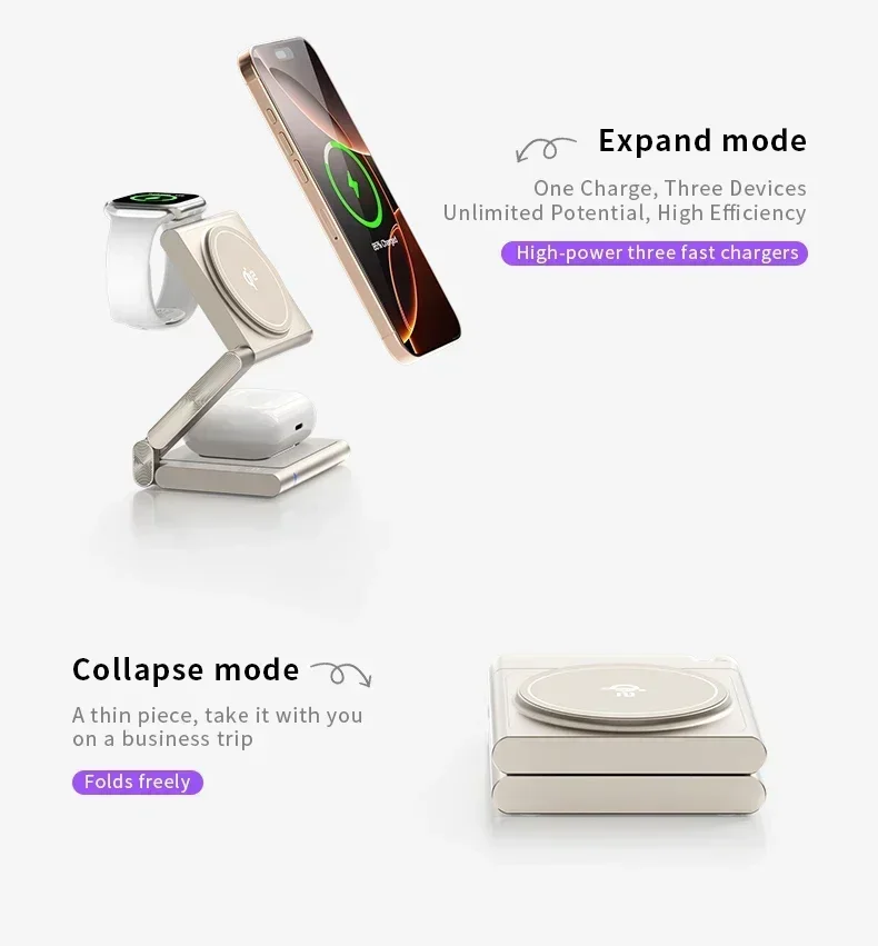 Qi2 3 In 1 Foldable Magnetic Wireless Charger Mobile Phone Stand For iPhone 16 15 14 AirPods iWatch 9 8 7 Fast Charging Station