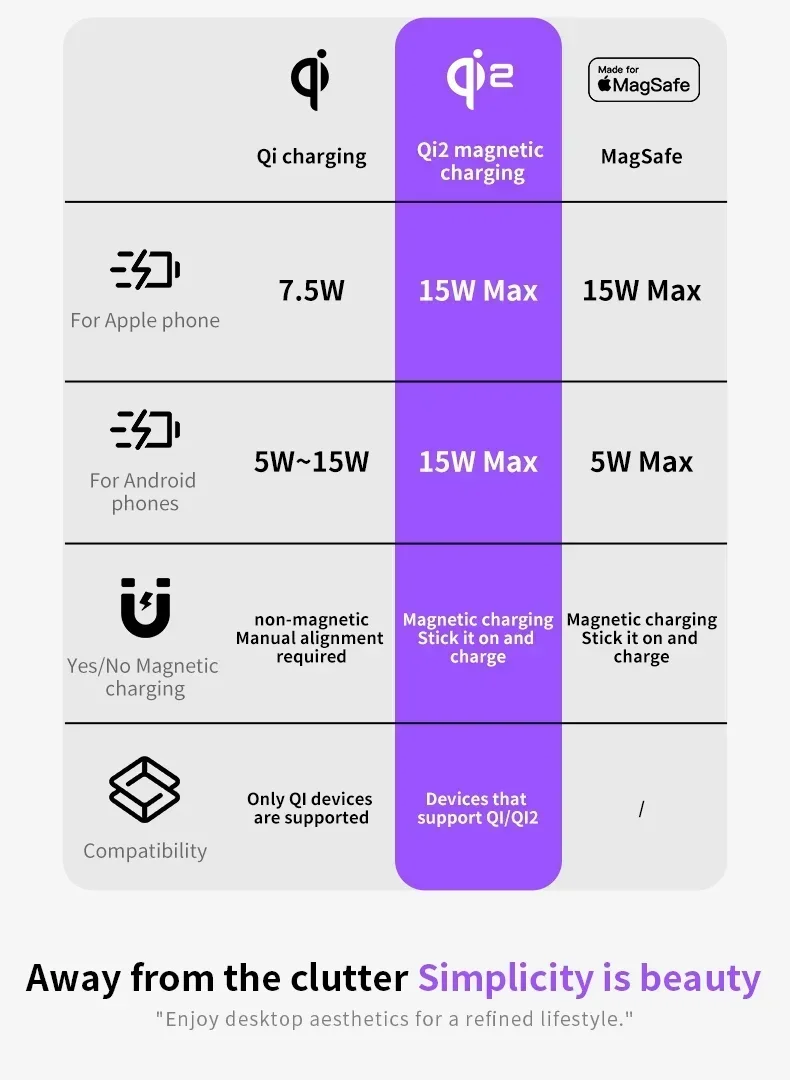 Qi2 has up to 15W of wireless charging power and magnetic attraction characteristics.