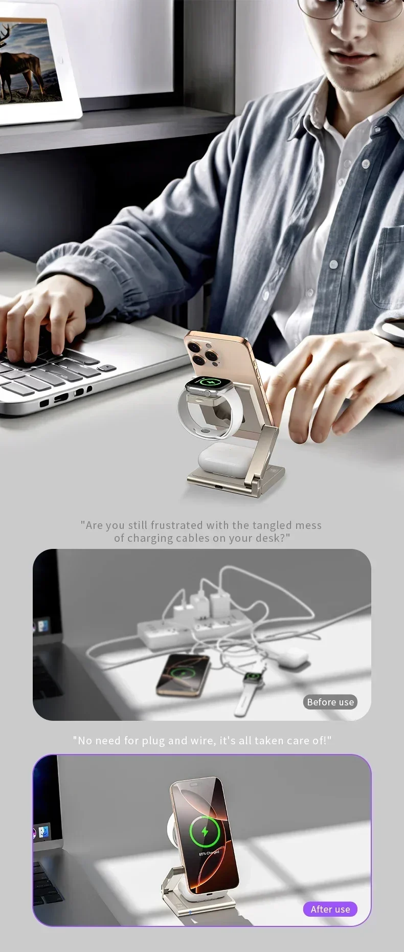 【3 in 1 Wireless Charging Station】fast charging of 3 devices at the same time. Compact and stylish design, say goodbye to the messy desktop. Bringing users a faster and more convenient experience.