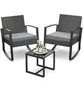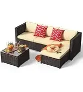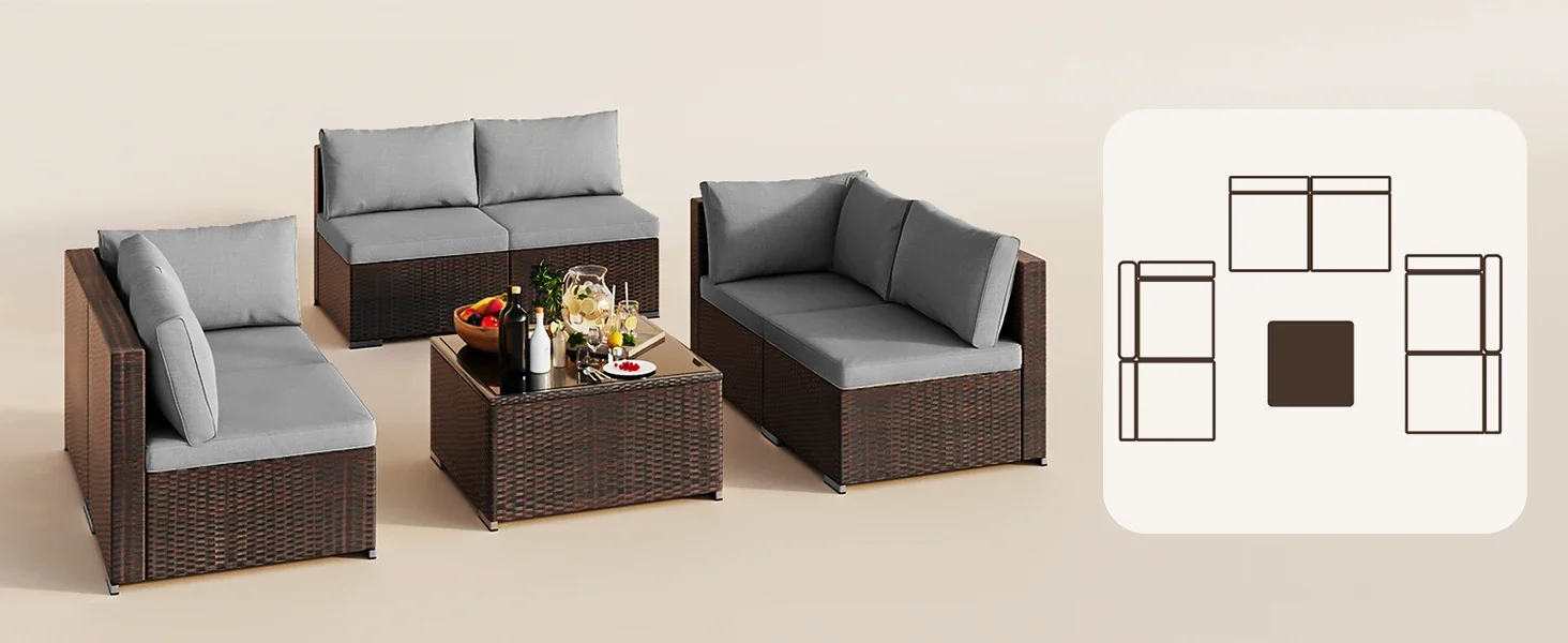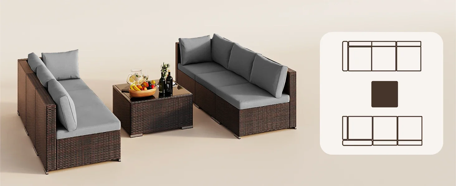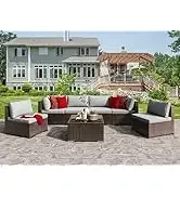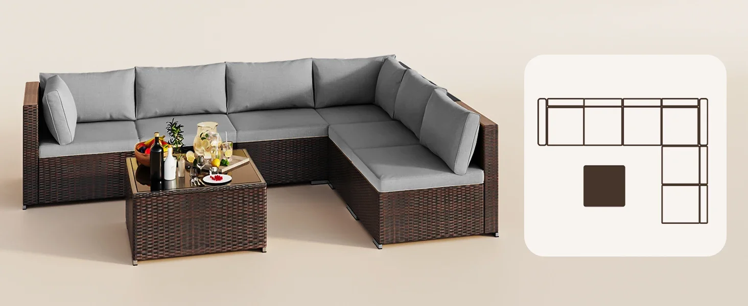 QQsun 7-Piece Sectional , PE Rattan Outdoor Furniture Patio Conversation Set with Cushions and Glass