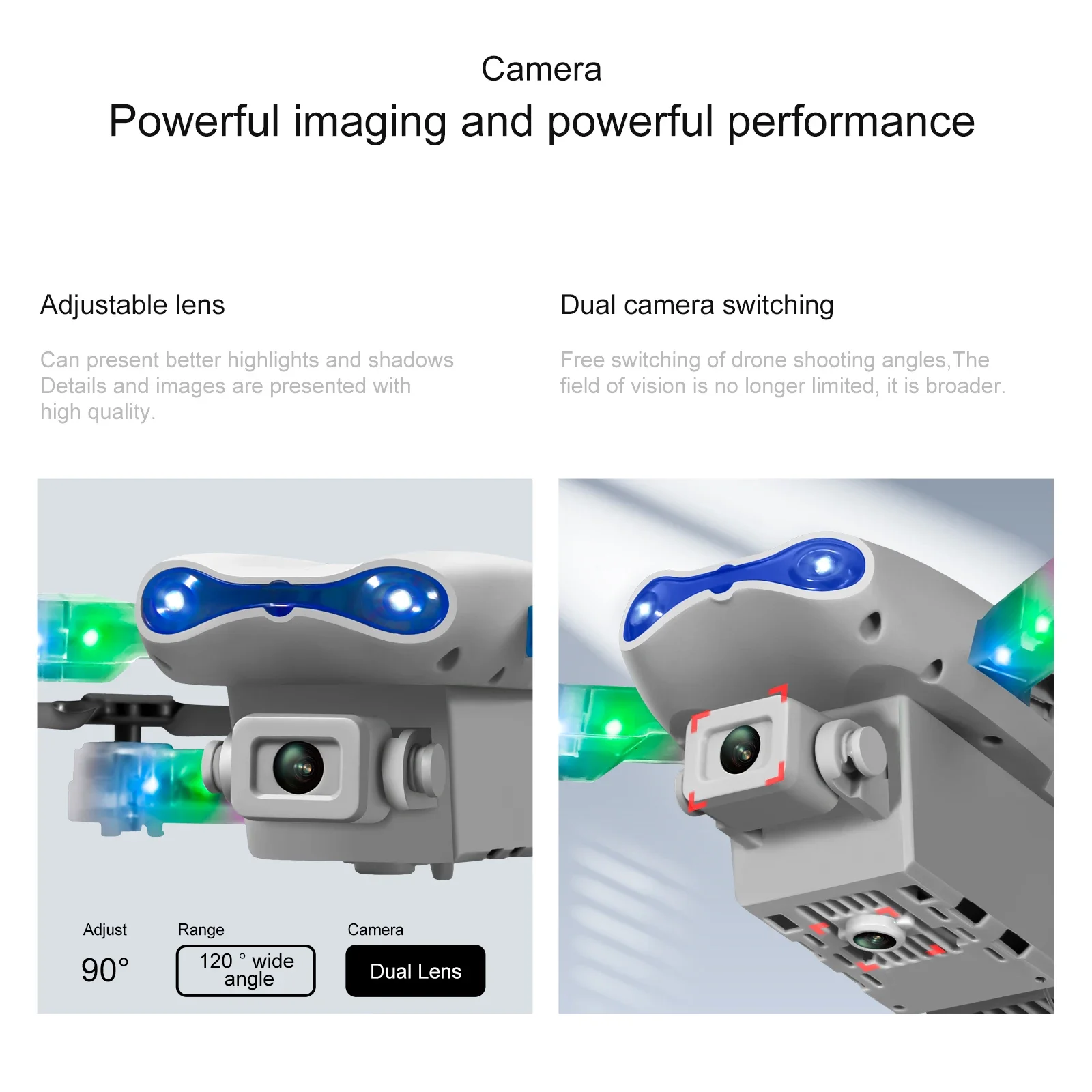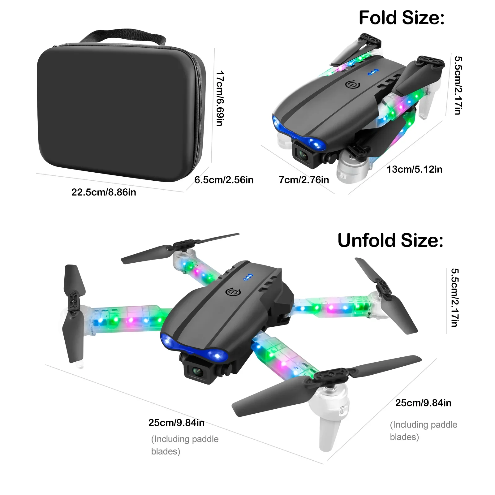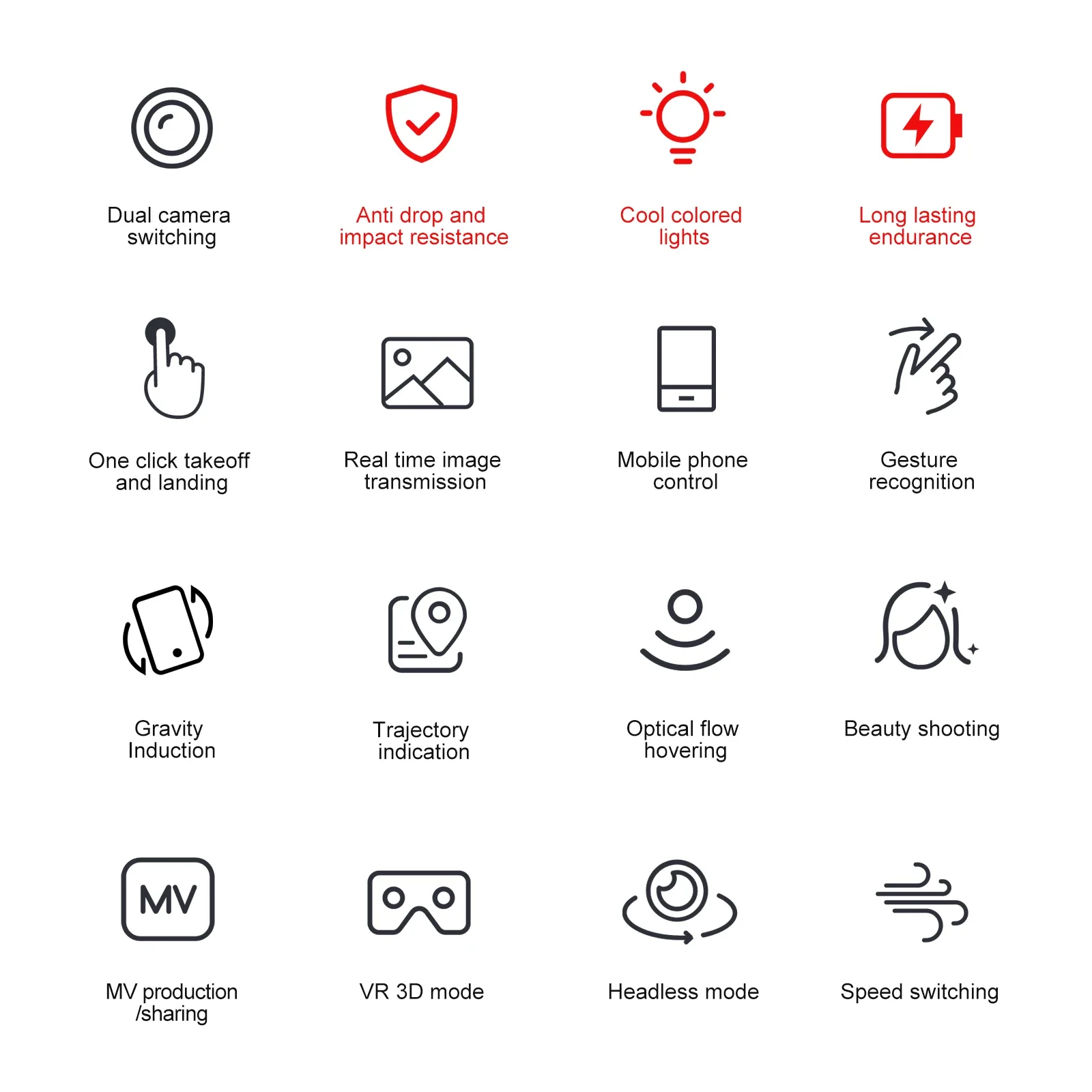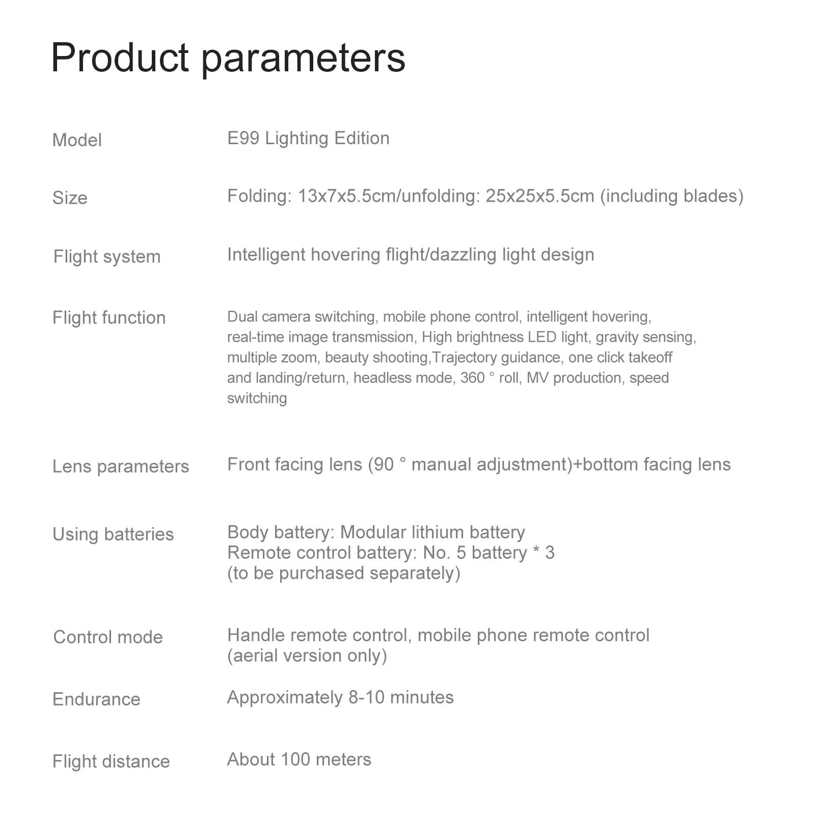 Dual camera switching, fixed height function, foldable aircraft, six pass with gyroscope; one-key take-off, one-key landing, ascent and descend, forward and backward, left and right side fly, steering, headless mode (with camera can be added Functions: Gesture photography, video, headless mode, emergency stop, trajectory flight, gravity sensor, automatic photography)