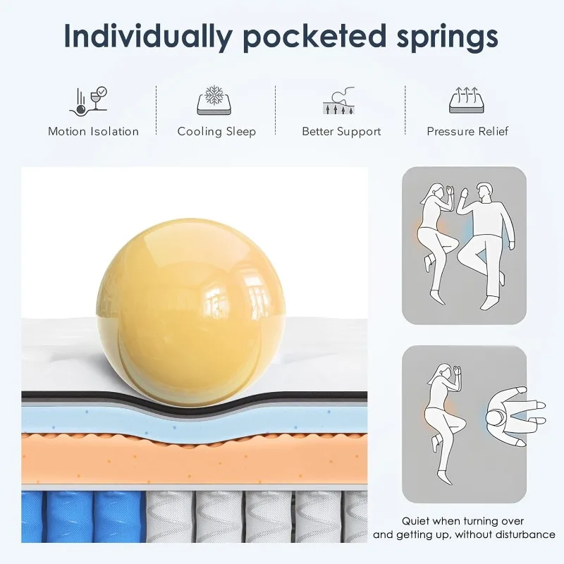 - 【Isolated Motion】: The individually pocketed coils in this queen bed mattress operate independently to isolate movements and effectively absorb disturbances caused by tossing and turning. Regardless of your partner’s or child’s activity during the night, enjoy an undisturbed sleep and wake up refreshed.