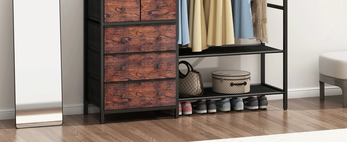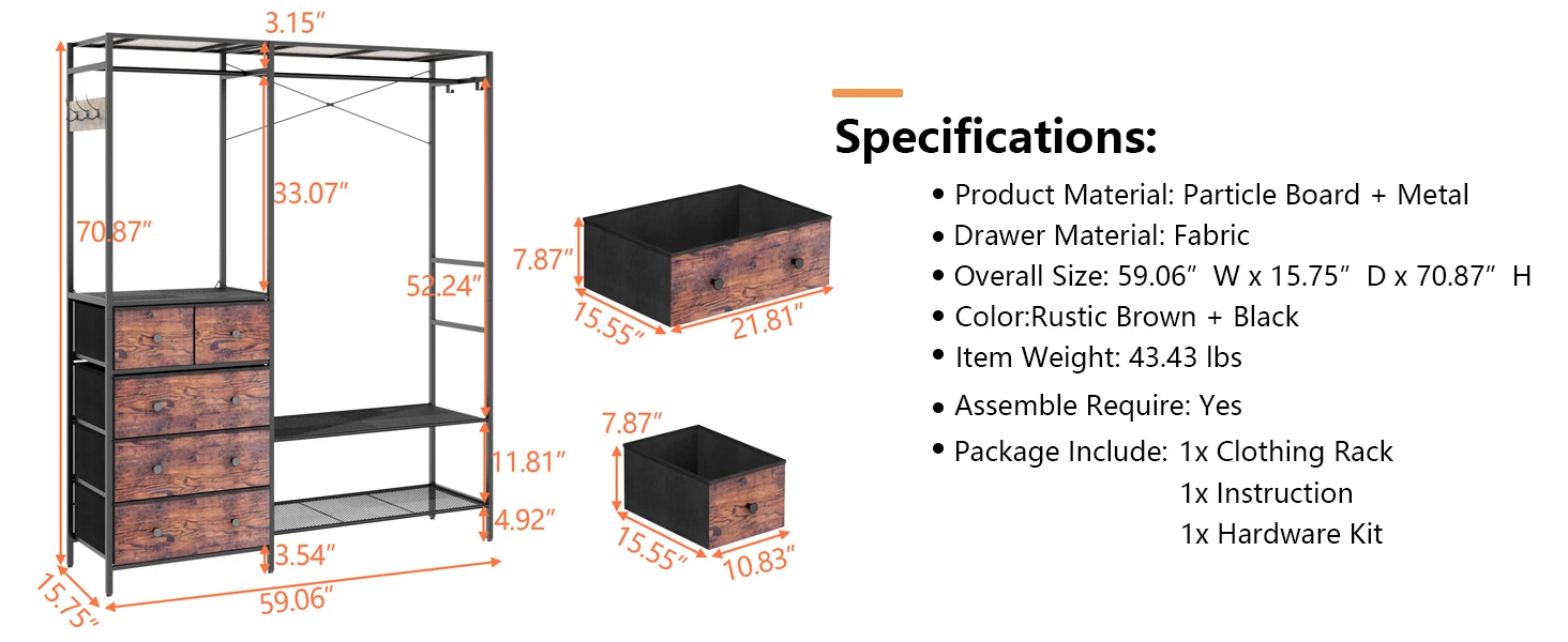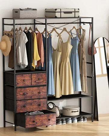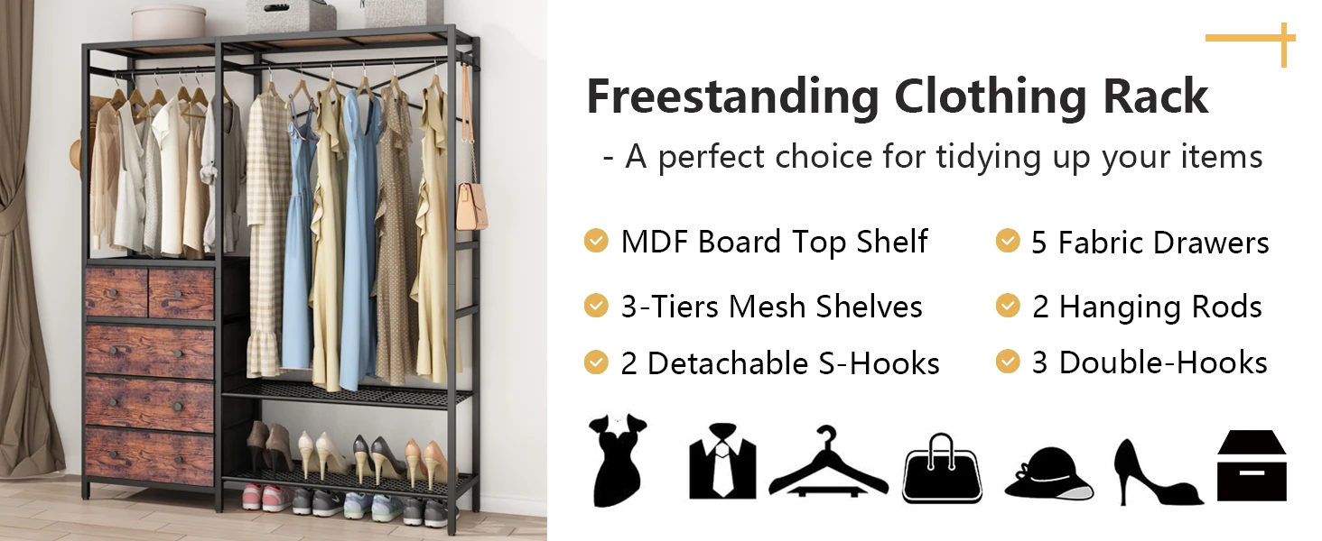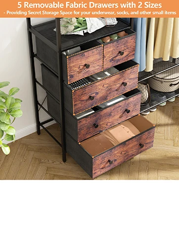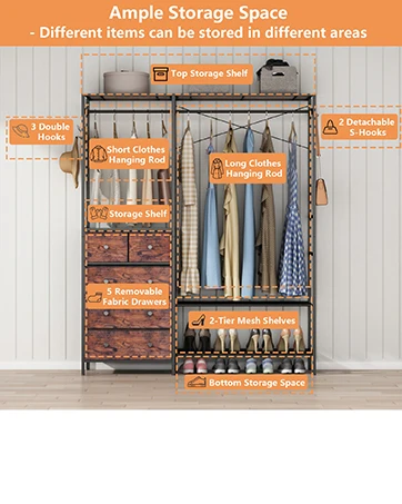 Rack with 5 Drawers & 4 Storage Shelves, 59.1W*70.9H Heavy Duty Clothing Rack with 2 Hanging Rods, Wardrobe Closet Organ