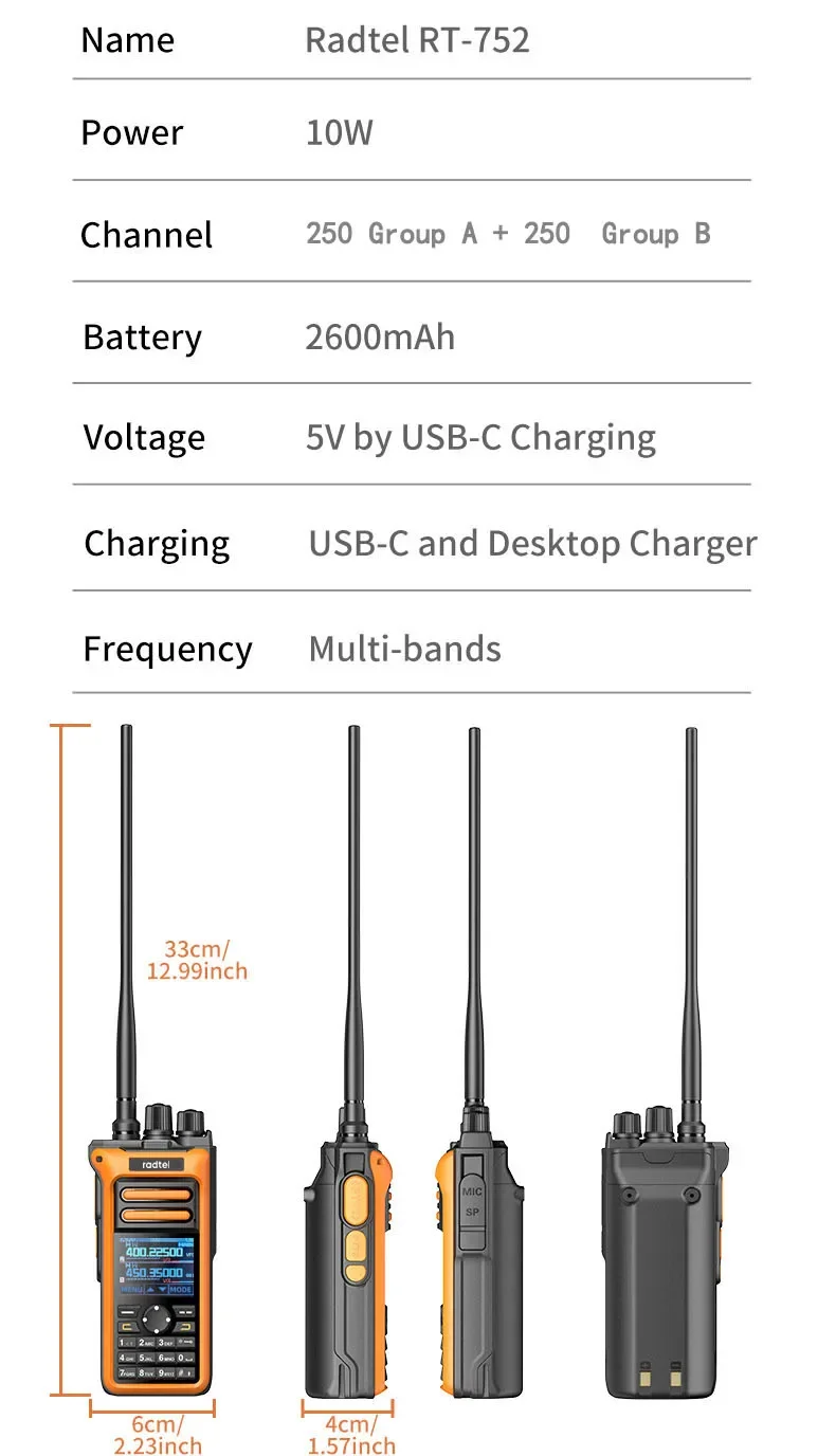 Radtel RT-752 10w Air Band Walkie Talkie Full Band Amateur Ham 250CH HT USB-C Battery NOAA FM AM Recording Vibration