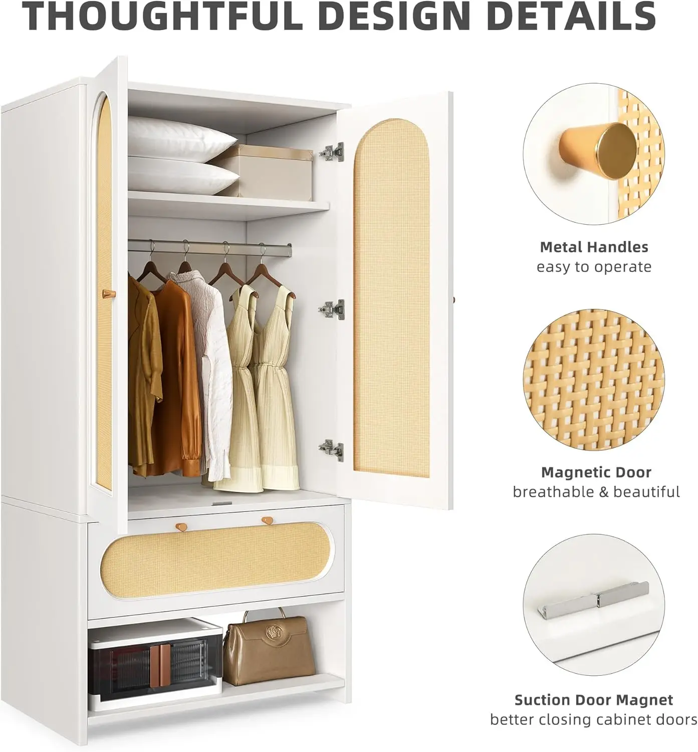 - Modern design : Large wooden wardrobe is simple and elegant, it combines white and natural rattan with golden handle to create minimalist charm. Adopts natural rattan with handmade weaving technology, the natural rattan not only has the effect of absorbing moisture and heat but also delivering perfect visual effect, add charming to your home.