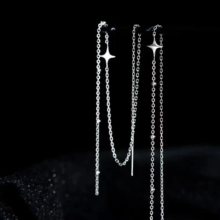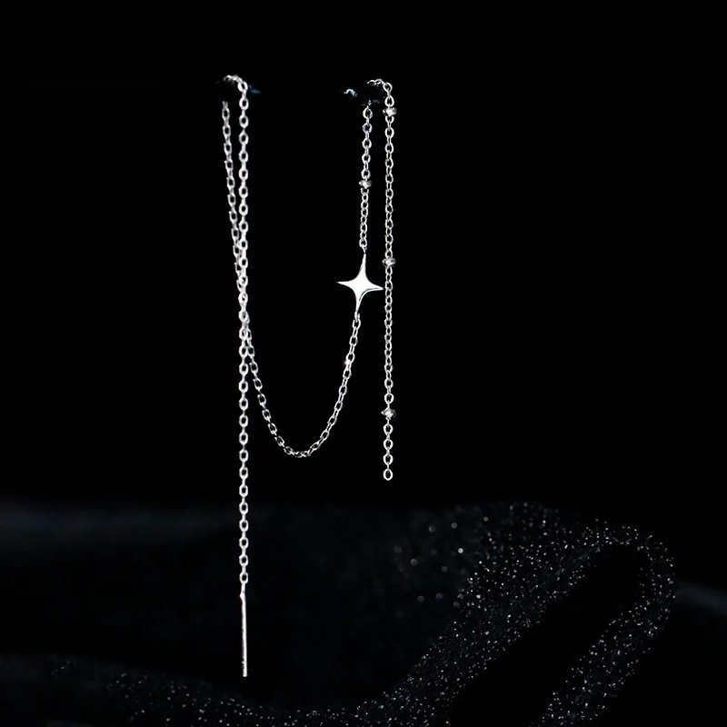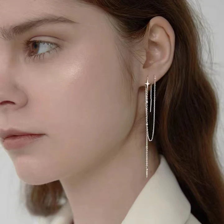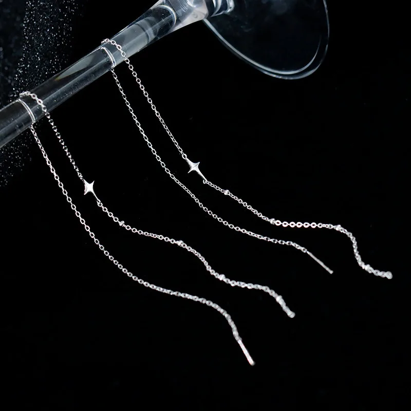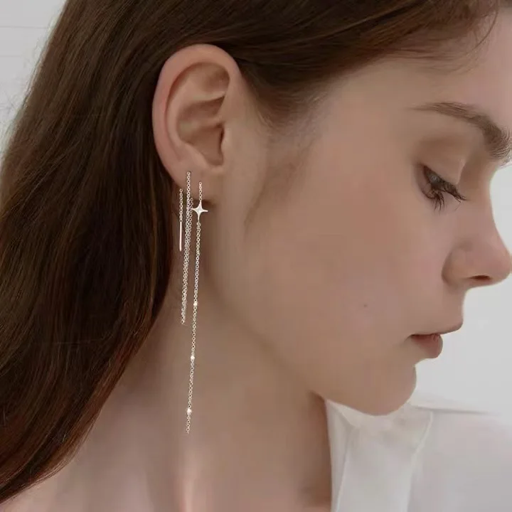 Real 925 Sterling Silver One Piece Long Style Star Tassels Drop Earrings for Fashion Women Fine Jewelry Minimalist Accessories