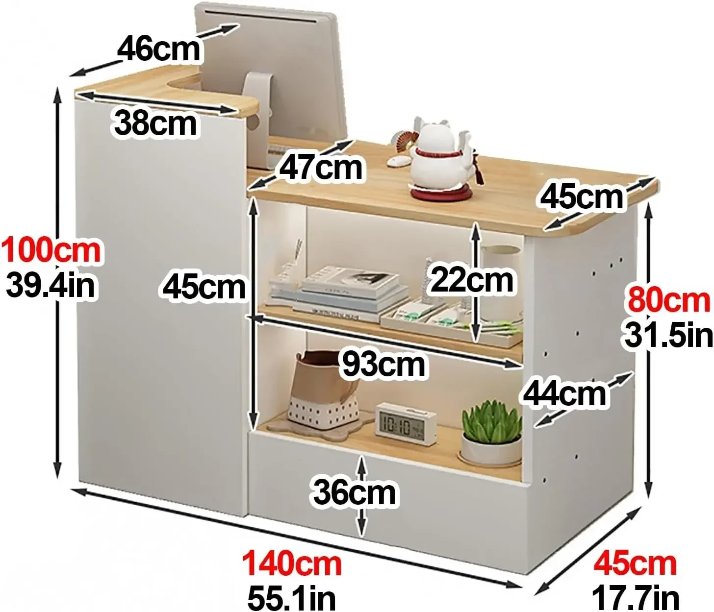 - Large Capacity: The reception desk with counter cashier adopts a multi-storage layout, with scientific proportions between drawer storage and space filing cabinets, making it easy to operate. Documents and personal belongings can be stored in lockable drawers for added security. Rounded and polished corners protect your family and avoid pain from impacts.