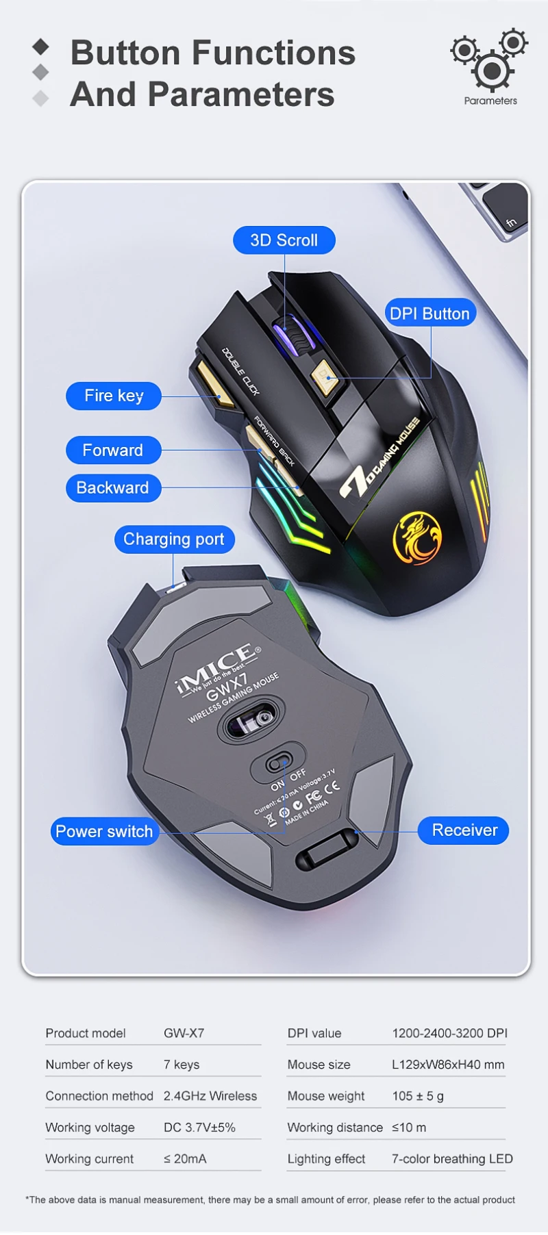5. 7 Buttons Designed for Gaming: The mouse has 7 buttons, including forward/back fast shot-cut and fire keys, that are optimized for gaming.