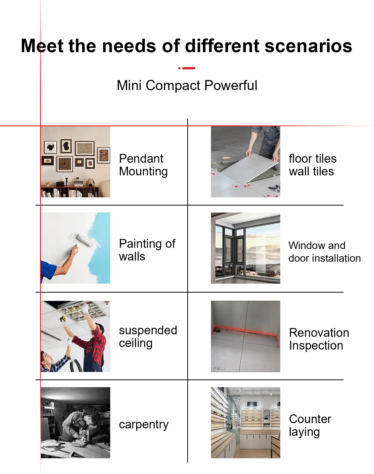 – **DIY Projects:Picture hanging, shelf installation, and decorative layouts.