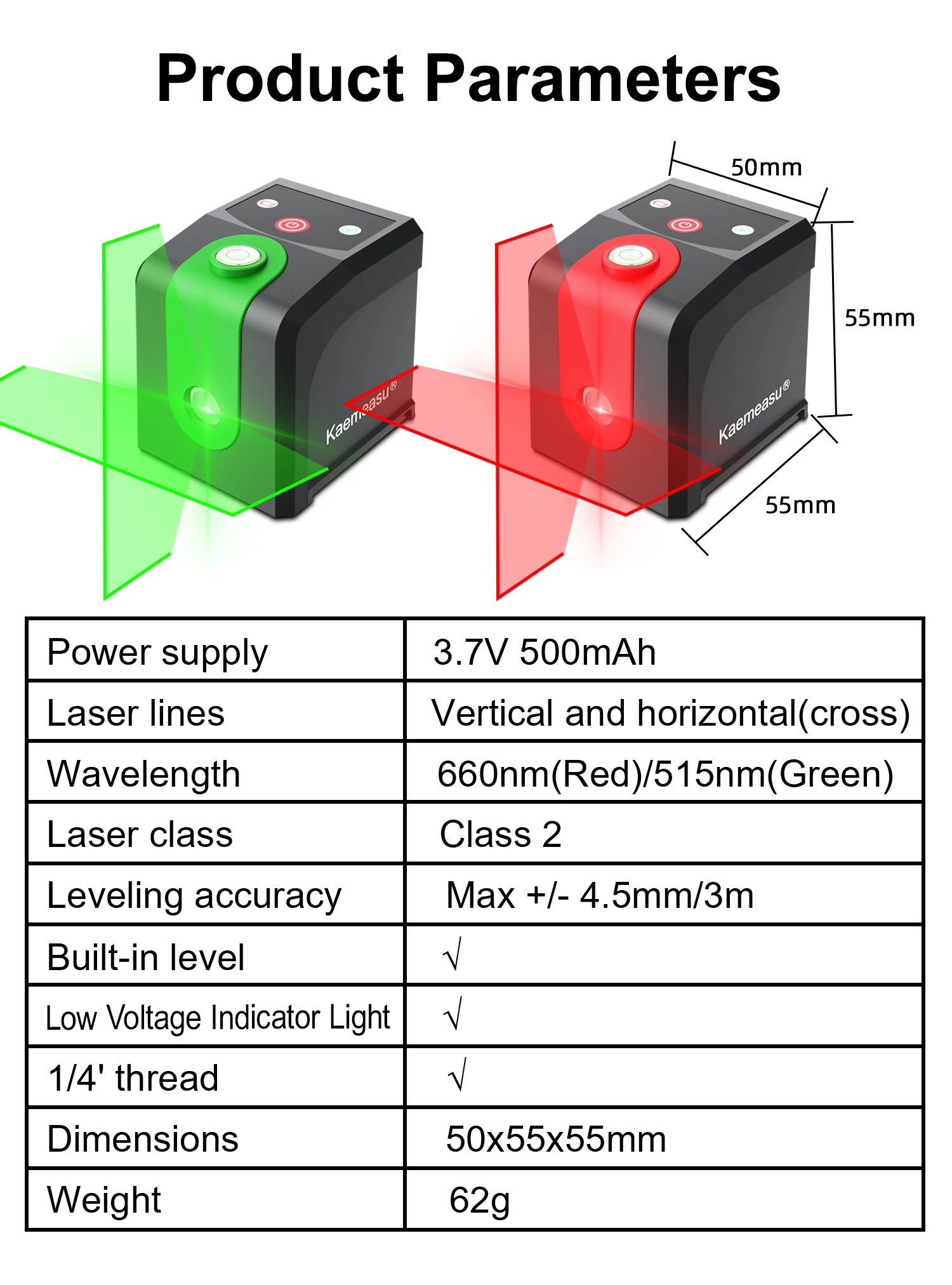 – **Dual Laser Colors:Red for indoor use, green for brighter environments.