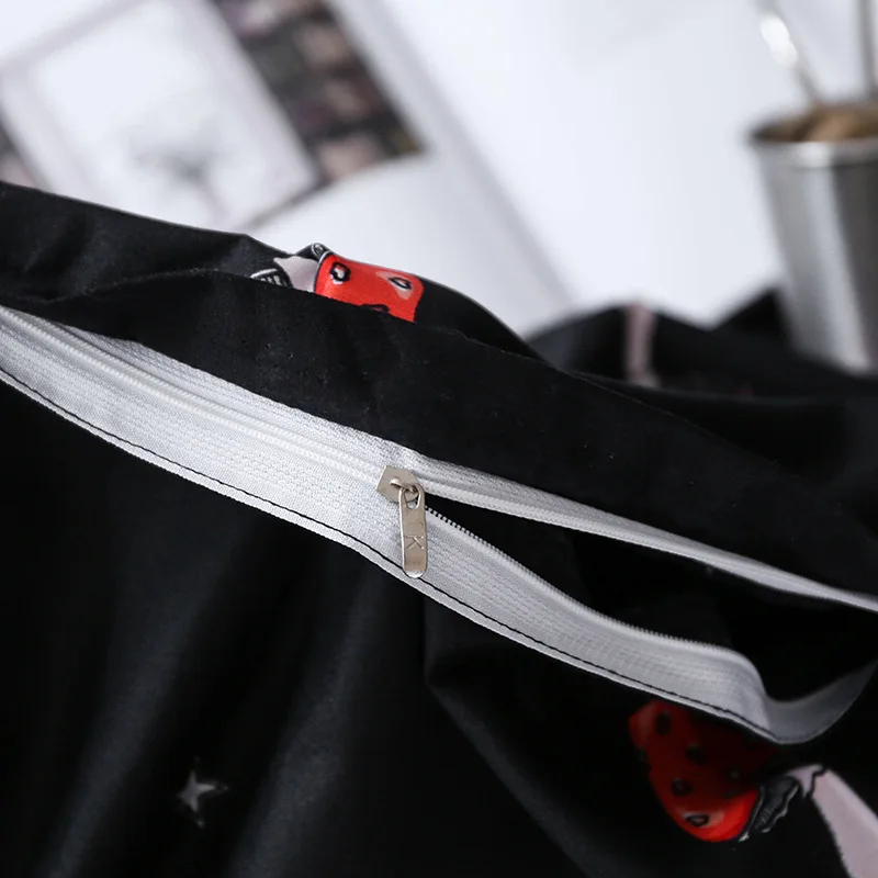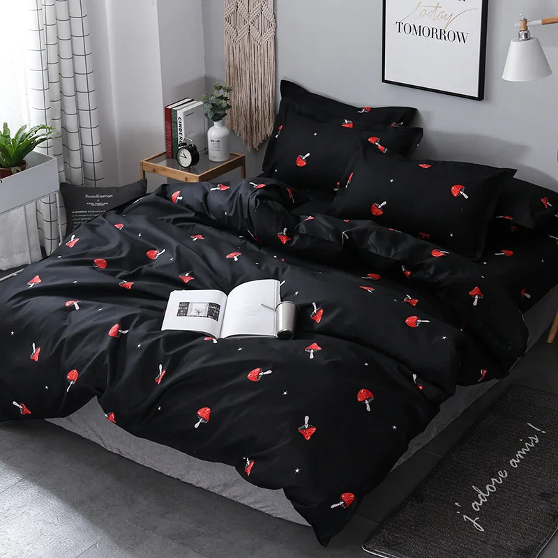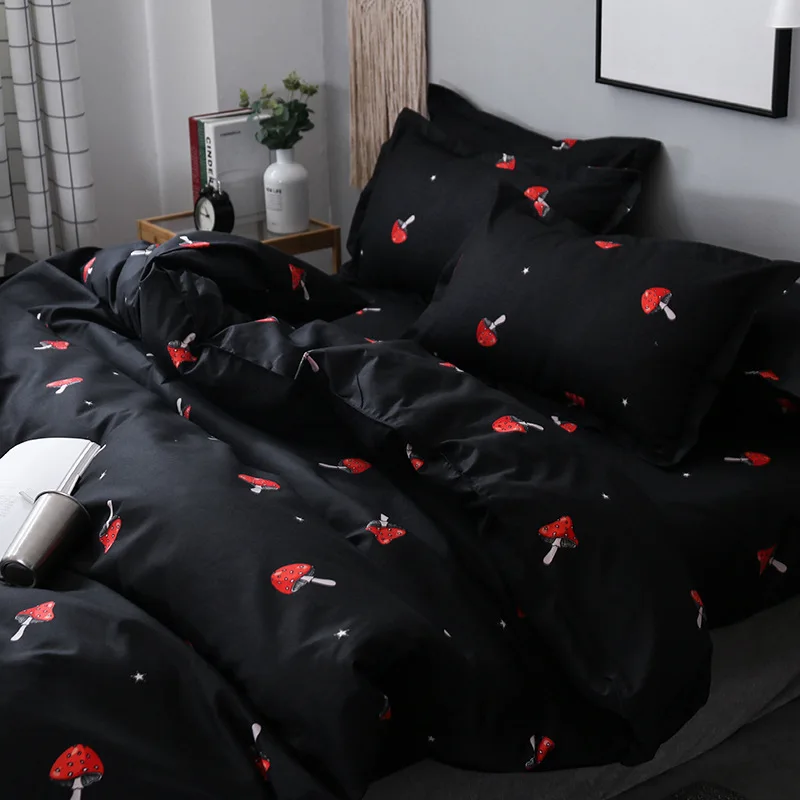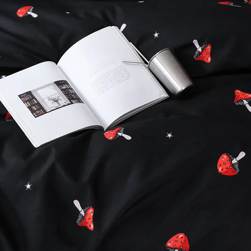 Red Mushroom Pattern Bedding Sets, Soft Bed Linings, Double Duvet Cover, Pillowcase, Queen and King Size, Black Color, 3PCs