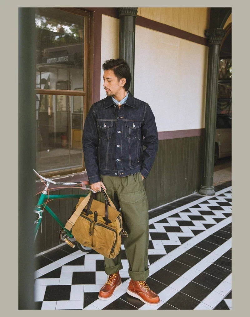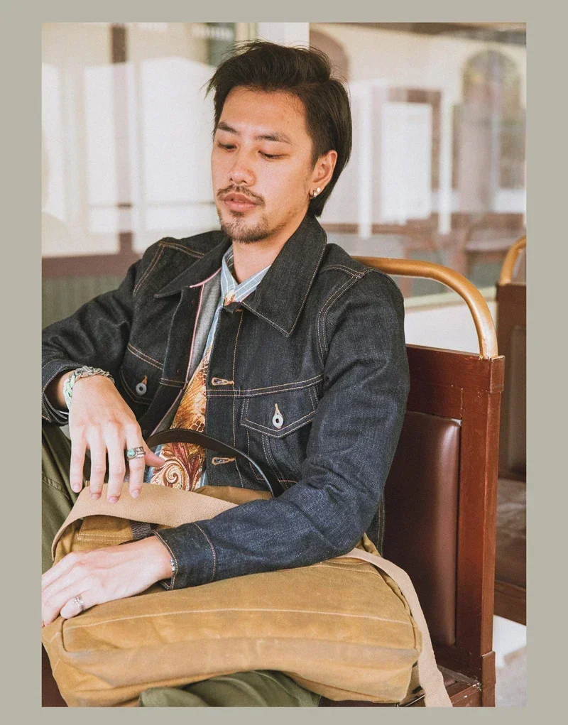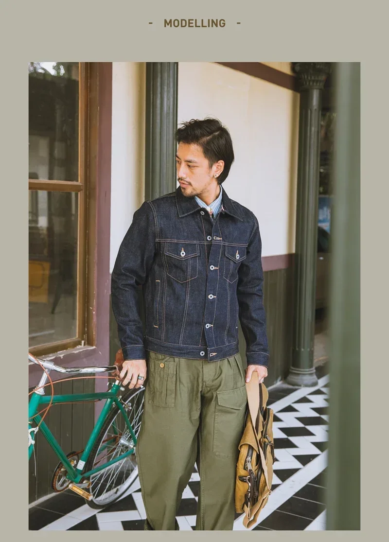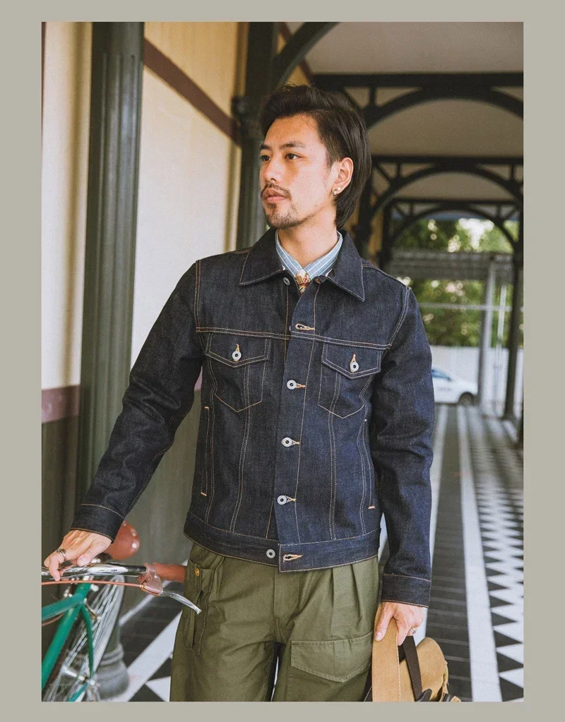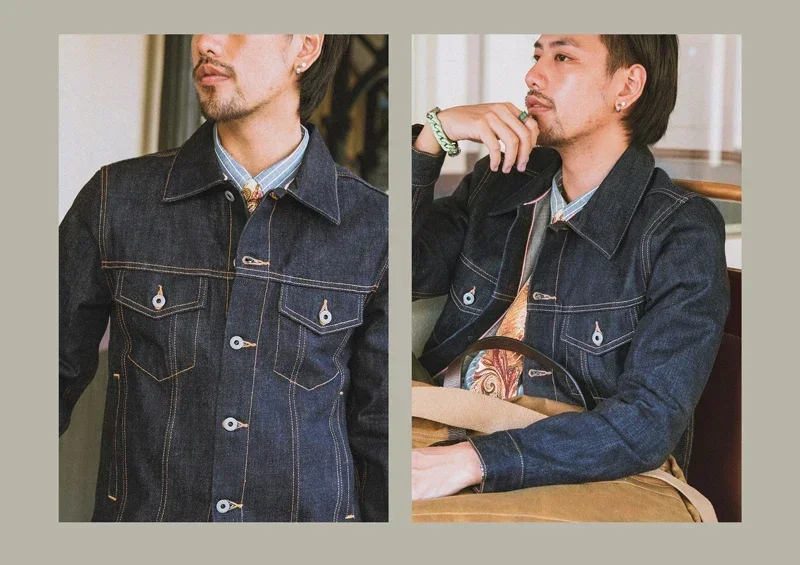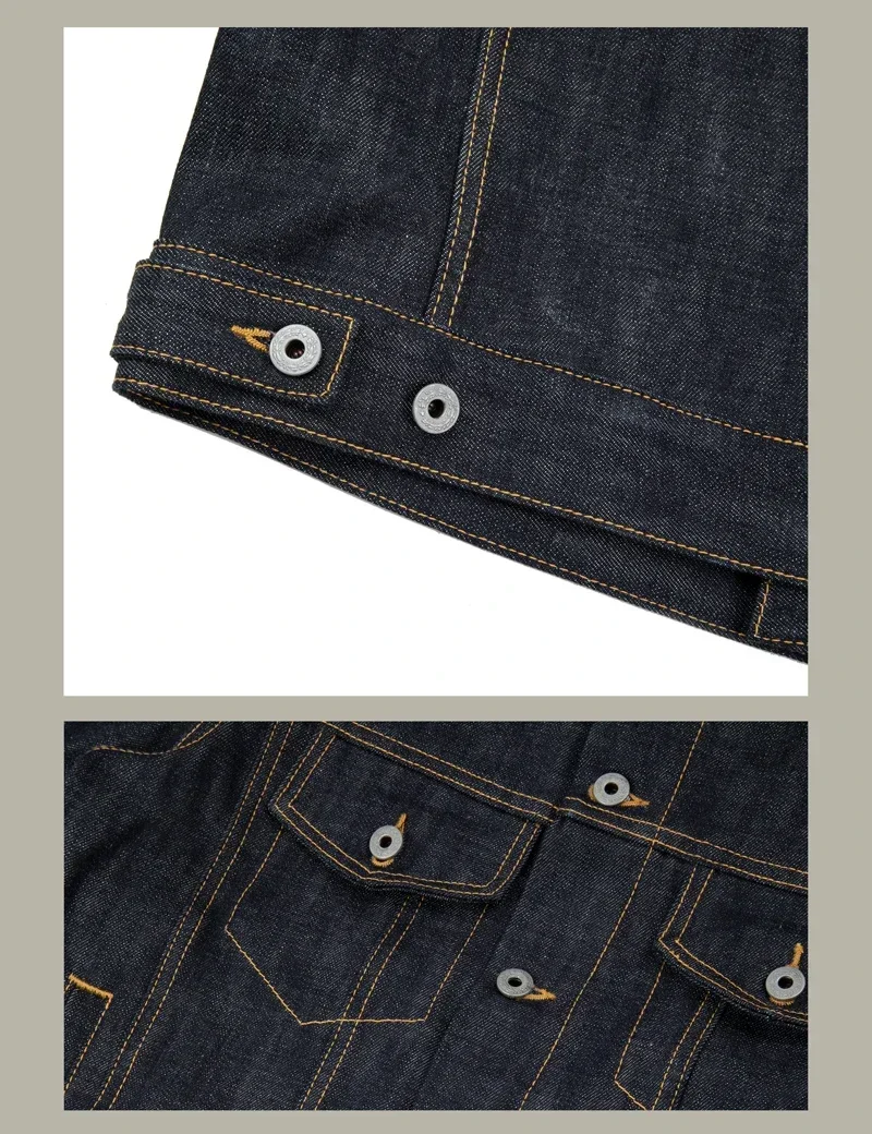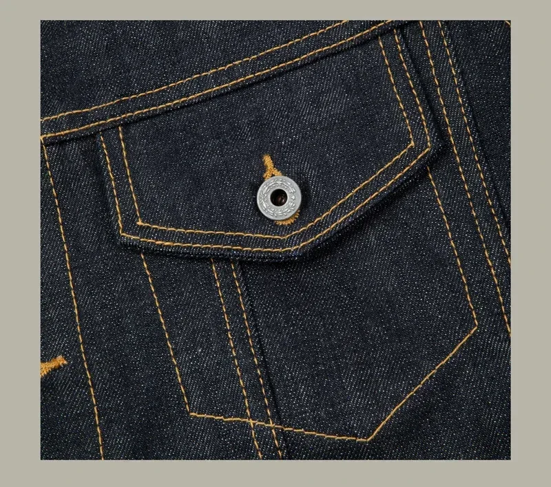 ⦁ Timeless style, the Classic Trucker Jacket ⦁ Made from 16oz pink line selvedge denim ⦁ Chest pockets with pointed flaps ⦁ Two slanted seams that run from chest pocket to waist ⦁ Buttoned cuffs ⦁ Waist epaulettes ⦁ Two side entry pockets ⦁ Branded leather patch ⦁ Orange stitching sewn throughout ⦁ Slim Fit, Please expect these shrink approx. 1cm in the width and 2-3cm in the length when washed