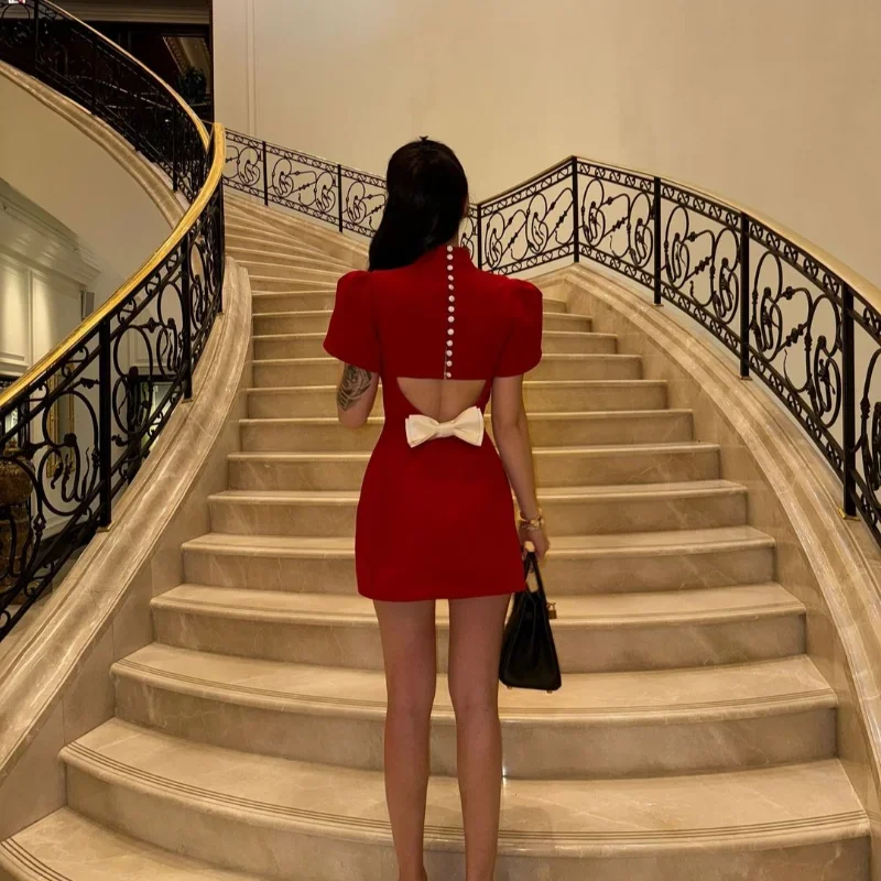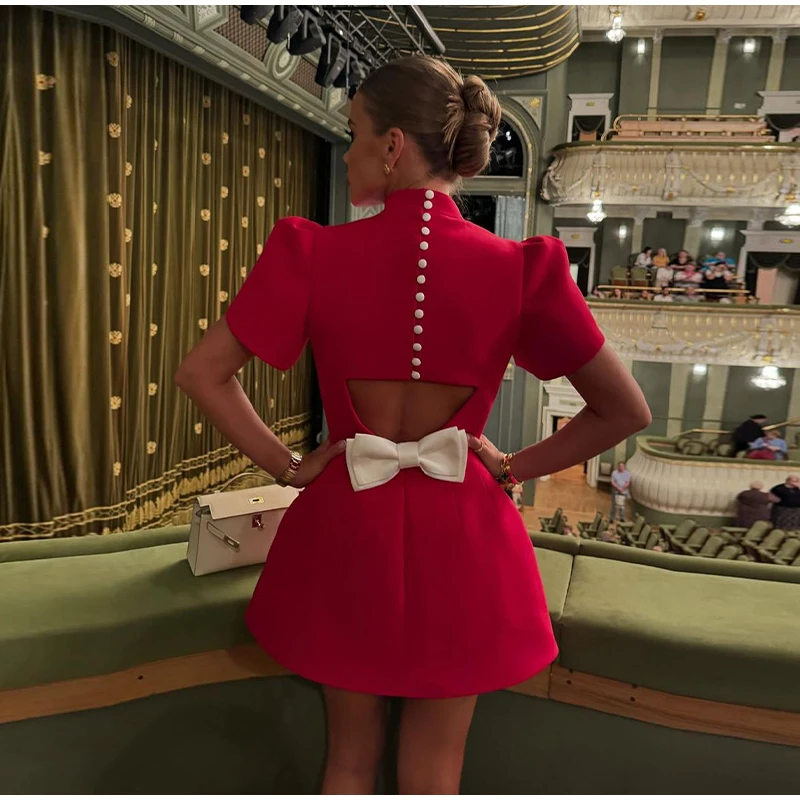 Red Women’s Back Hollow Out Bow Mini Dress Elegant Lapel Short Sleeve A-line Dresses New Sexy Chic Female Slim Party Short Skirt