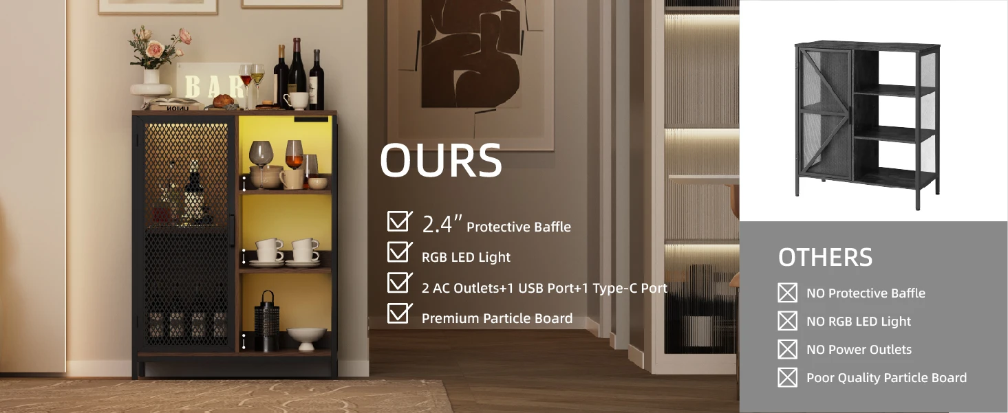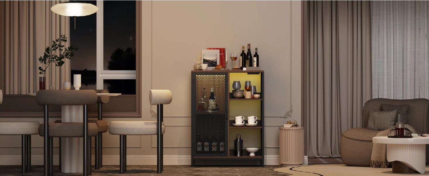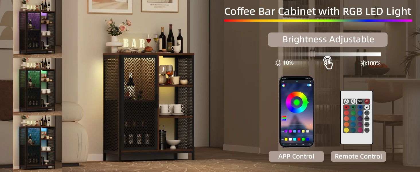 Dynamic LED Party Ambiance – Elevate your party with our mini bar cabinet's LED lights. Control 160k+ colors, 58 modes, and sync with music via app or remote. Surprise your guests and create the ultimate party experience!