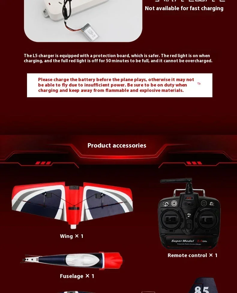 Product details: color box packaging *1, foam inner box *1, fuselage, main wing *1 set, horizontal tail *1 set, remote control *1, manual *1, battery *1, USB charger *1, spare blade *1.