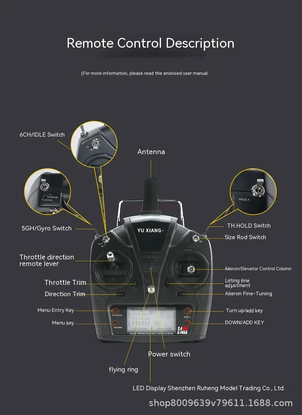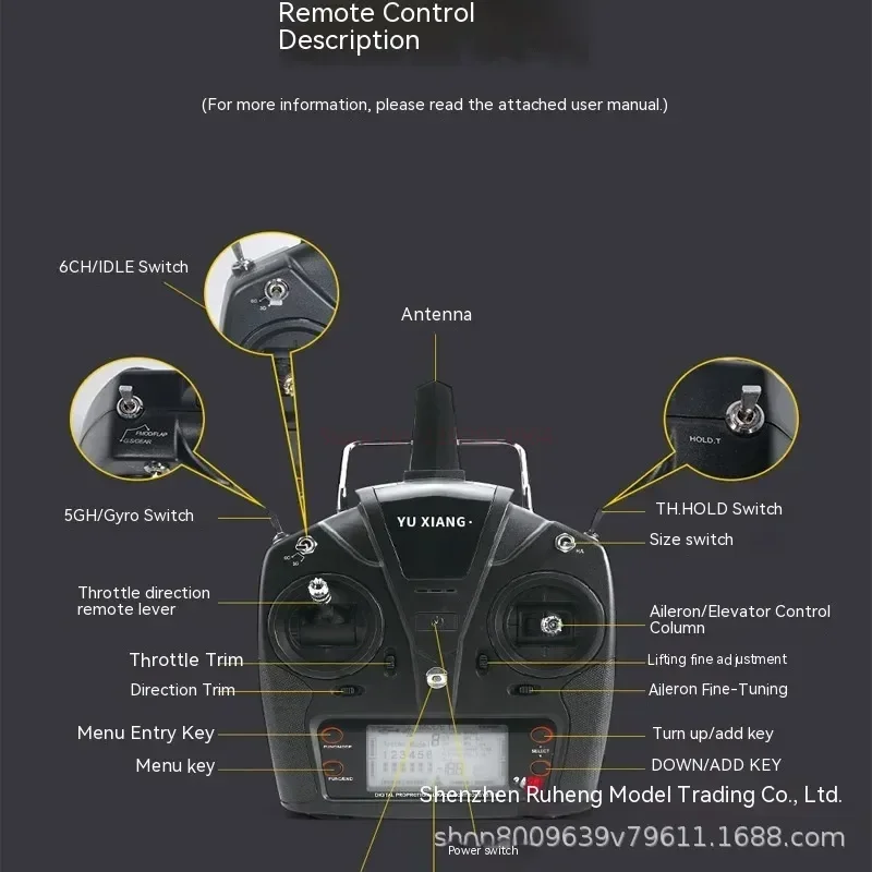 11. With standard six channel remote control, LCD display, power prompt, support digital parameter adjustment, support simulator function, optimize rocker output, and operate more finely.