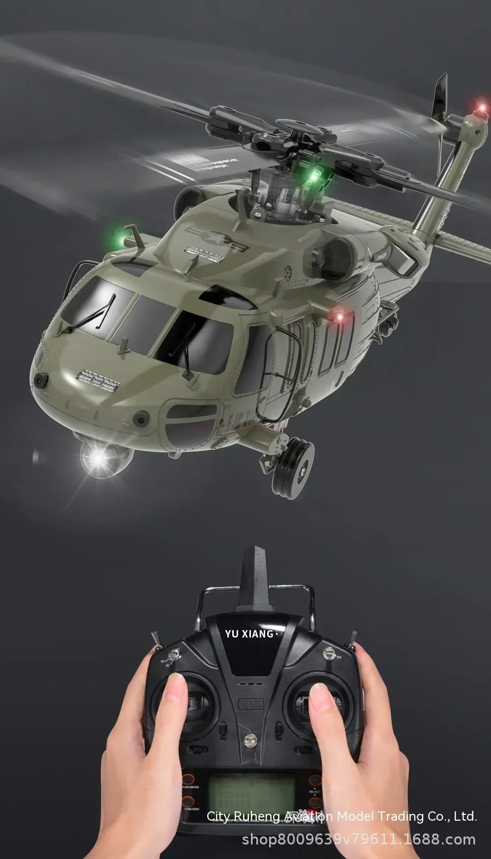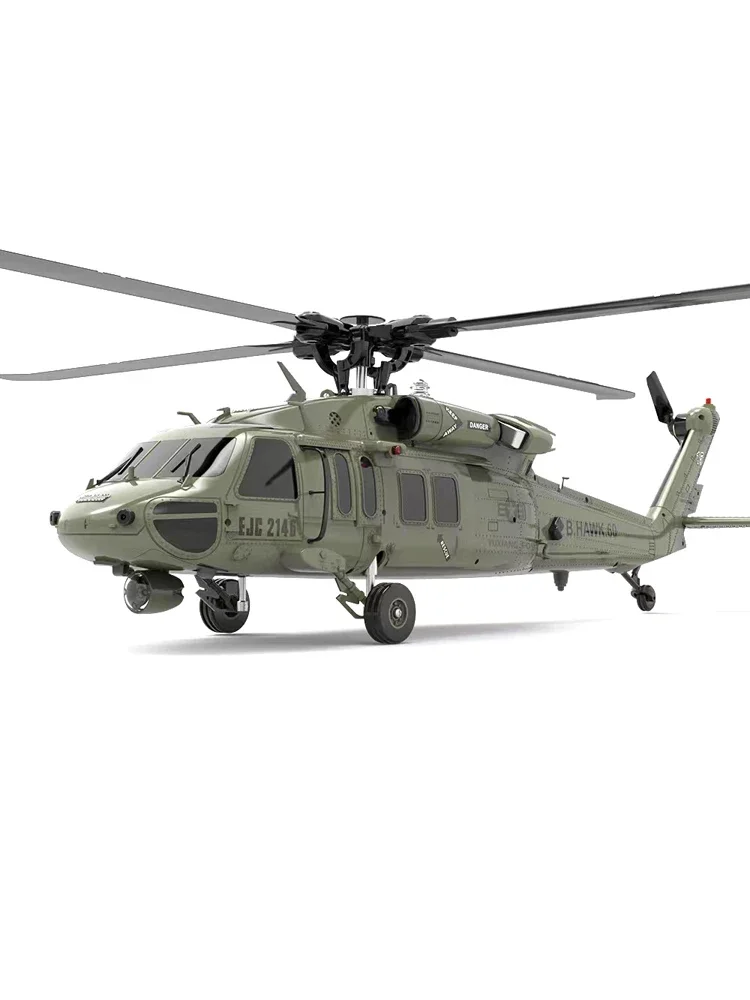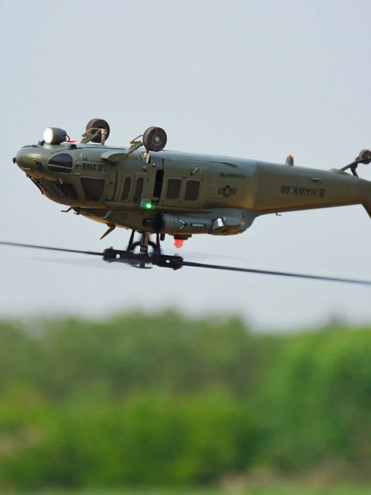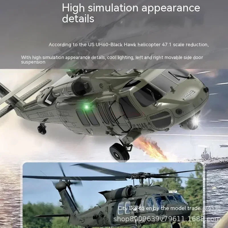 Scale down of the U.S. UH 60 Black Hawk helicopter with 47:1 scale. With high simulation appearance details, cool lights, left and right movable side door, and shock absorber of landing gear.
