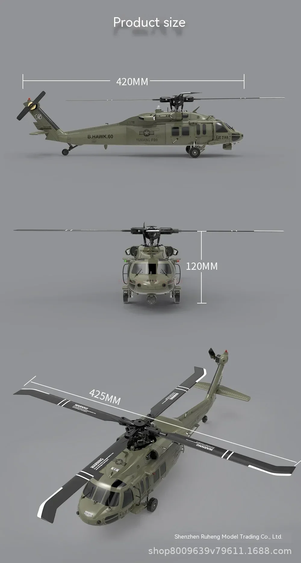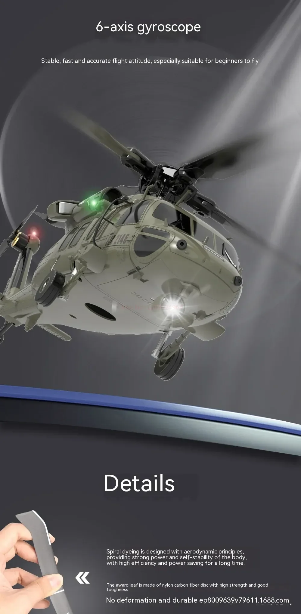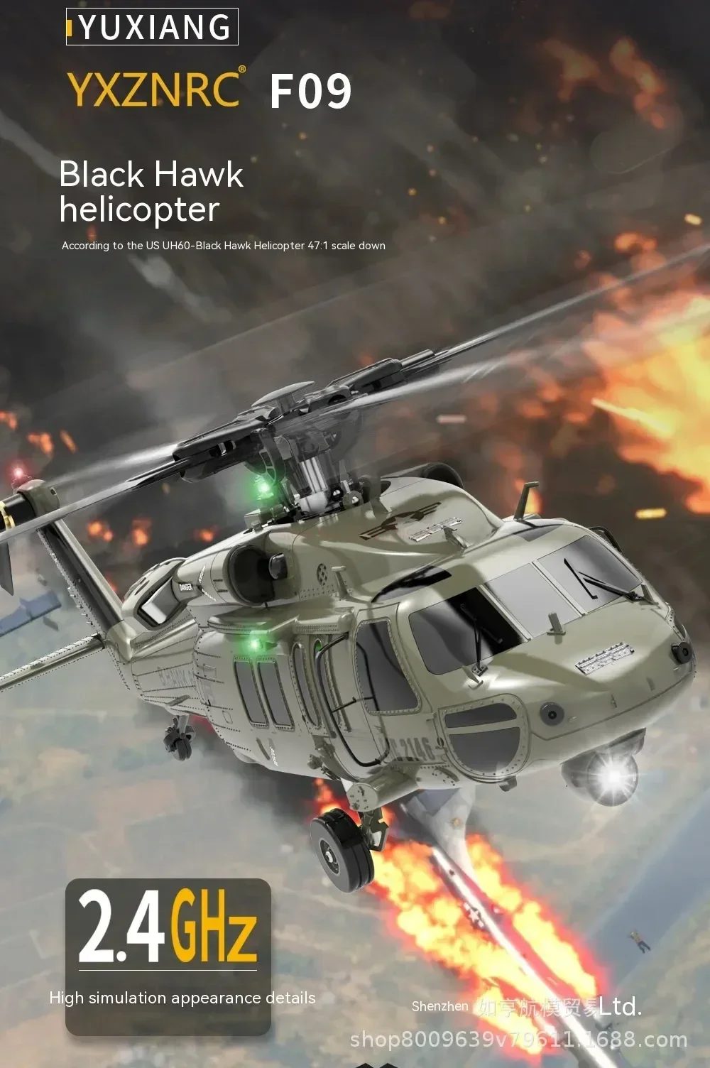 Scale down of the U.S. UH 60 Black Hawk helicopter with 47:1 scale. With high simulation appearance details, cool lights, left and right movable side door, and shock absorber of landing gear.