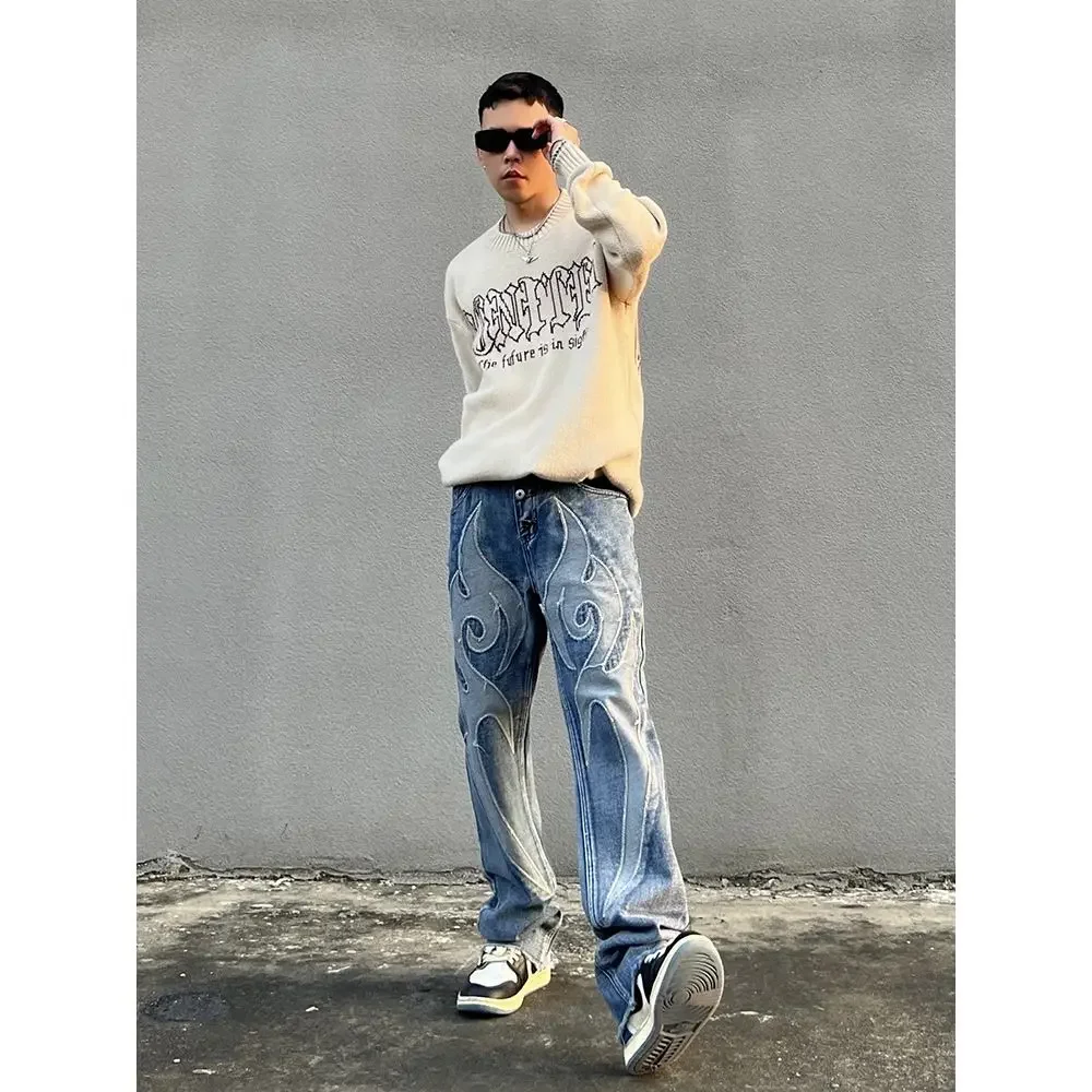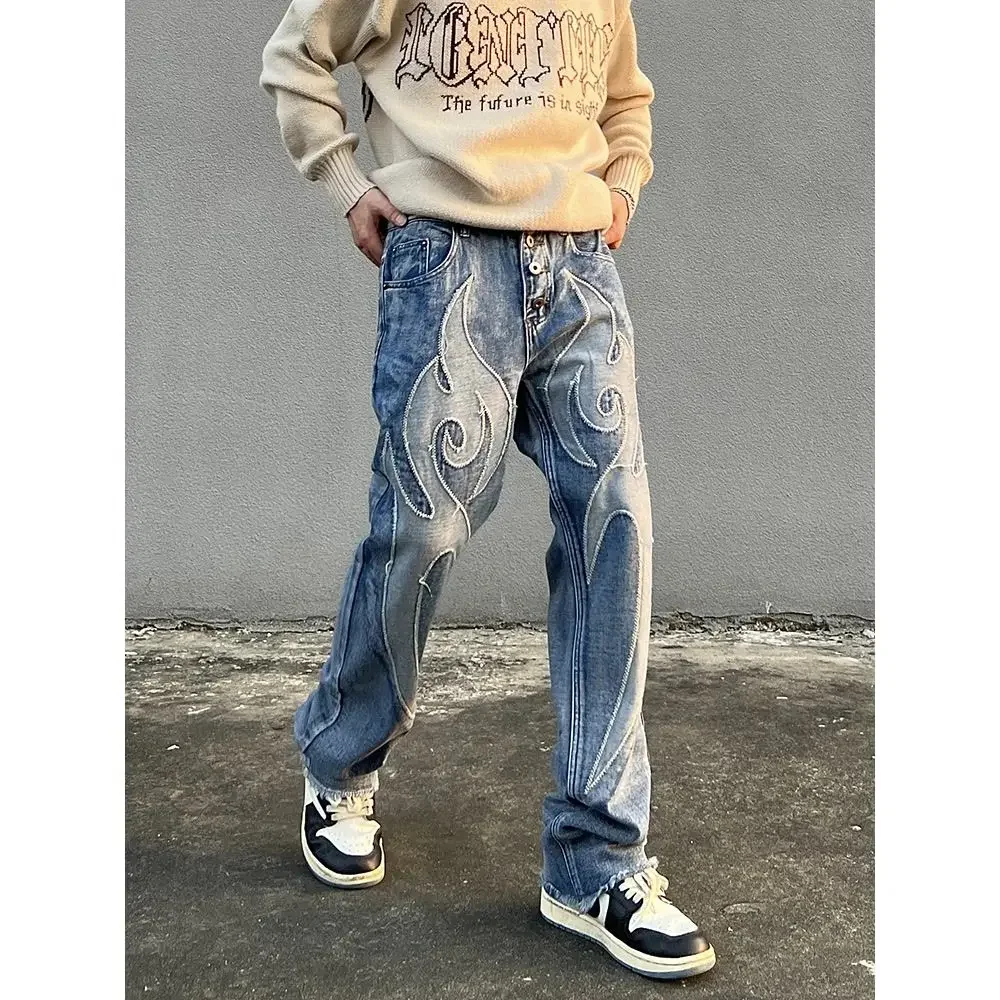 Retro high street quality men embroidered washed jeans American patchwork men and women loose straight pants