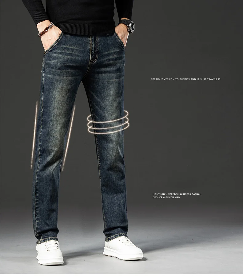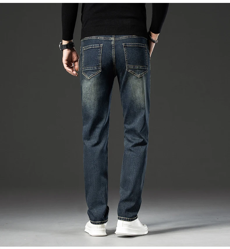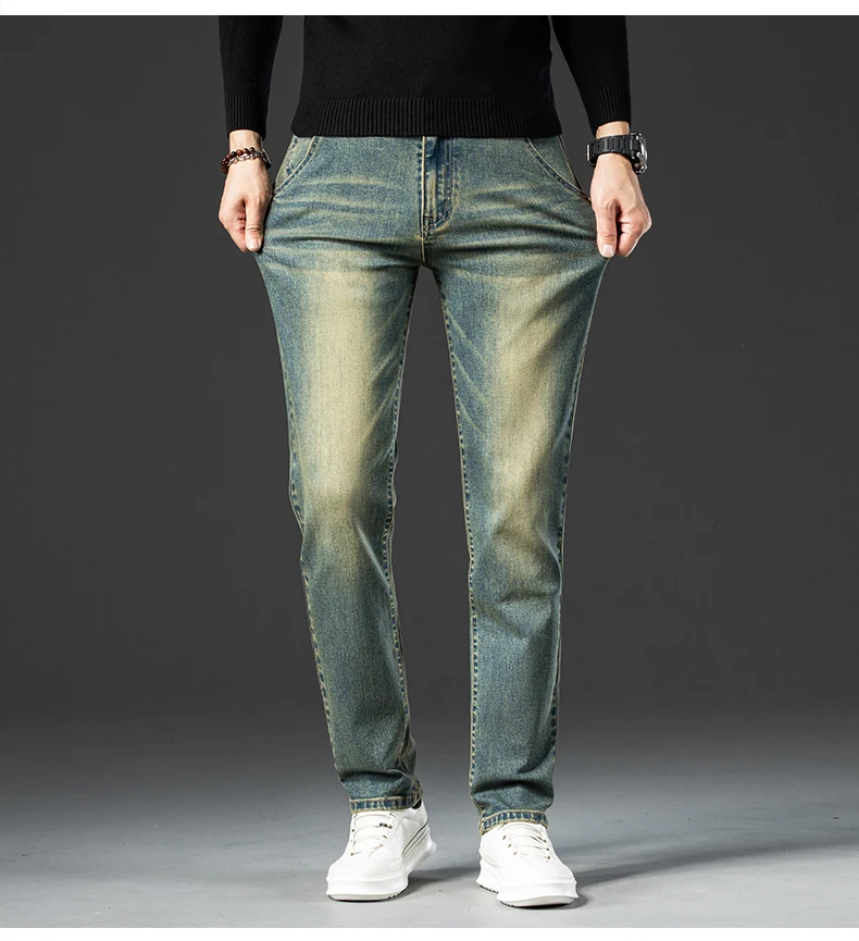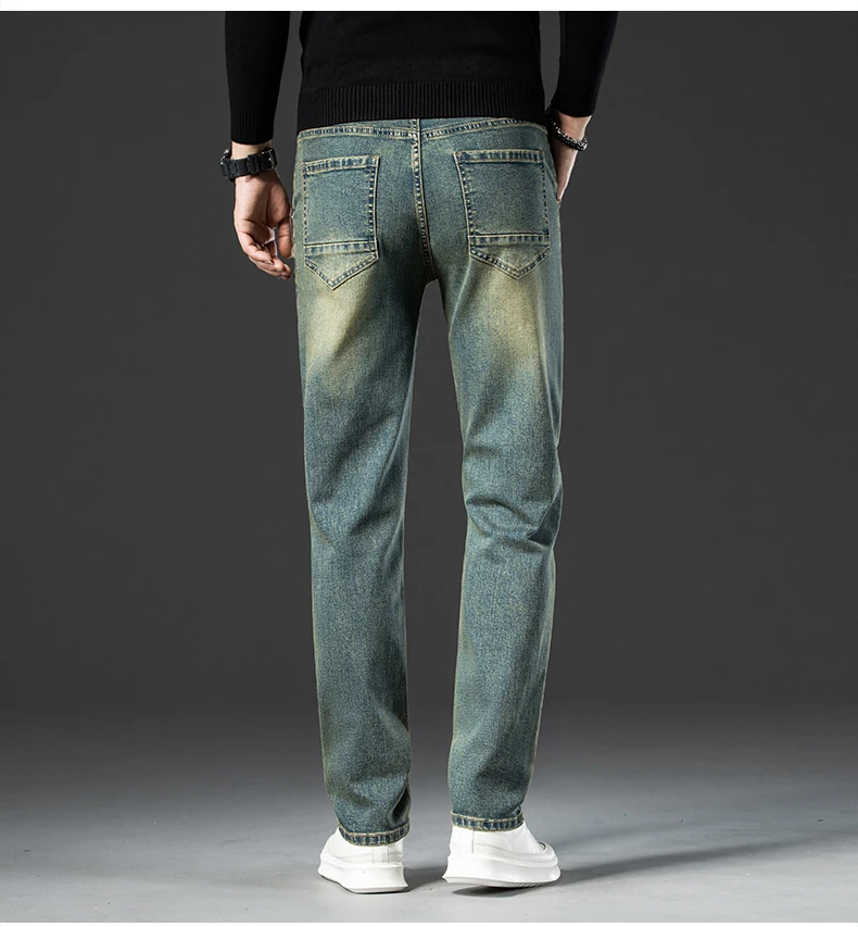 Retro Men’s Stretch Straight Jeans Washed Fashion Distressed Baggy Denim Trousers Male Full Length Classic Brand Pants