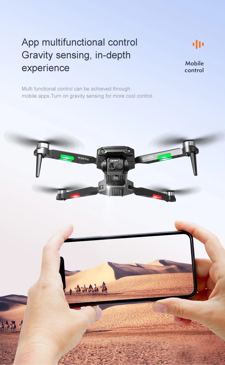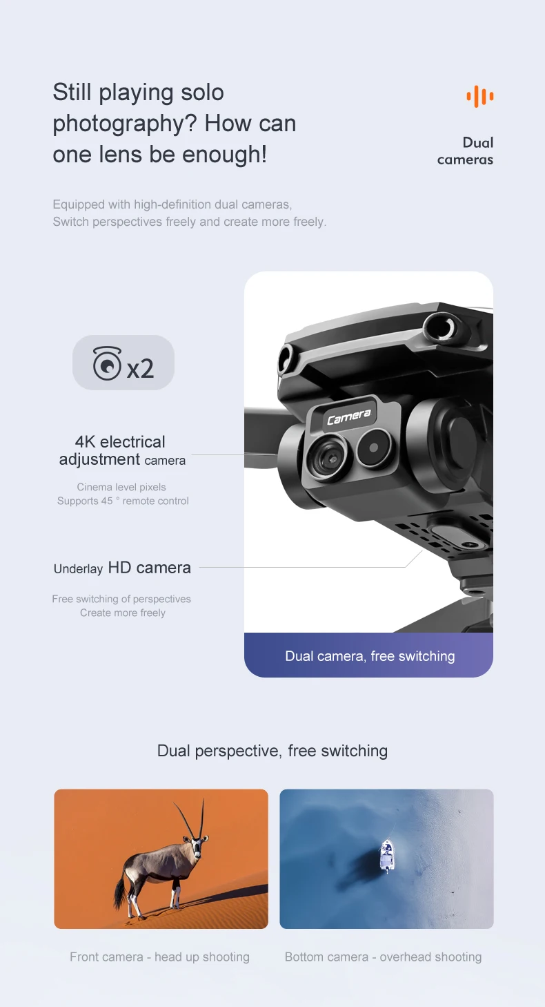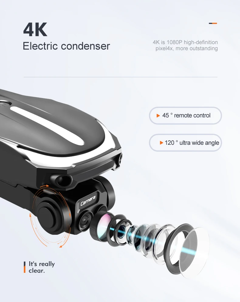 1. The front lens is placed with wide-angle 8K high-definition WIFI, and the optical flow high-definition lens at the bottom can switch the camera angle. The servo gimbal design increases stability, adding EIS electronic anti-shake, the picture lines are clearer.