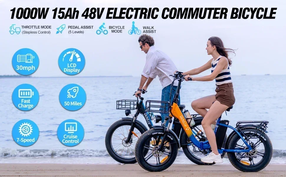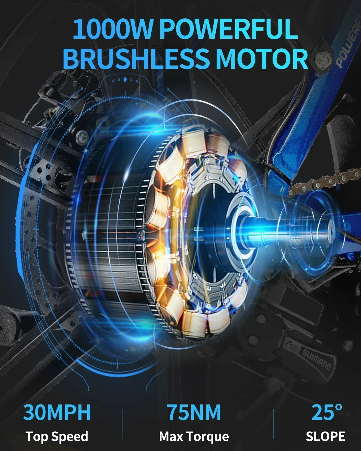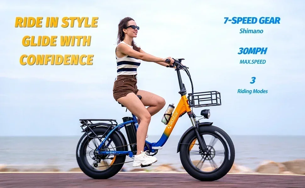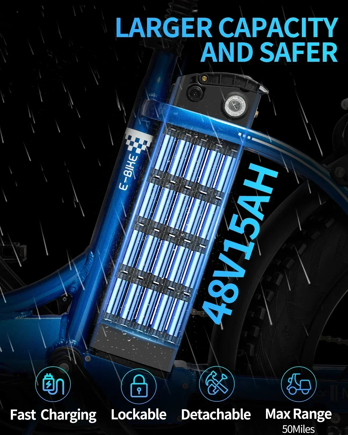 The Ridstar MN-20 ebike excels with its 1000W motor, effortlessly tackling 25-degree slopes. Its removable 48V15Ah battery (with UL&BMS system) provides an impressive range of 40-50 miles per charge. The waterproof and removable battery design ensures easy installation and reduces theft risk. Perfect for daily commutes, mountain rides, or leisurely cycling, this electric bike offers powerful features.