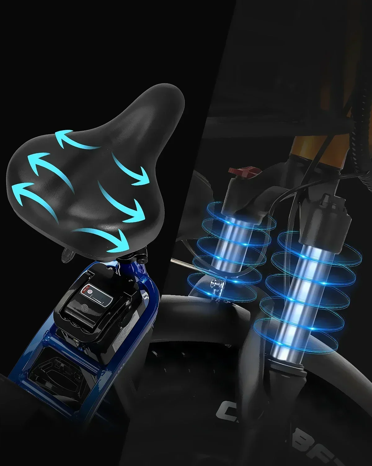 The upgraded 20×4” wide puncture-resistant fat tires provide superior performance and a sleek look. Experience a smooth ride with adjustable front suspension and seatpost. Stay in control with dual disc brakes and enjoy precise shifting with the Shamano 7-gear system. Stay safe with a bell, bright LED headlight, and brake light, even during nighttime rides.