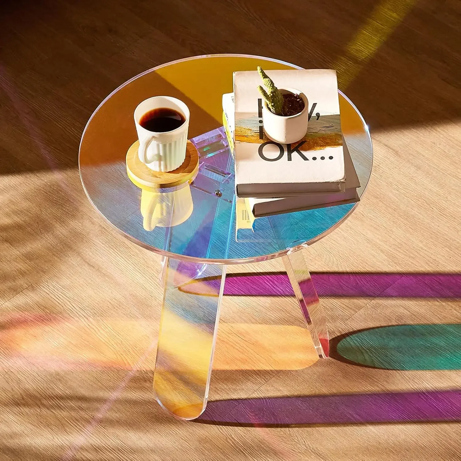 Round Iridescent Side Table, Acrylic End Table, Clear Rainbow Acrylic Coffee Table for Drink