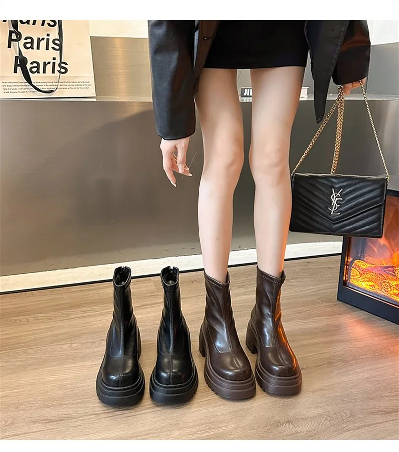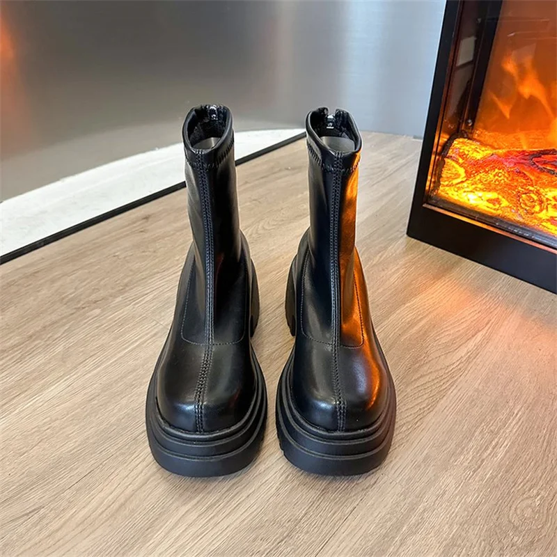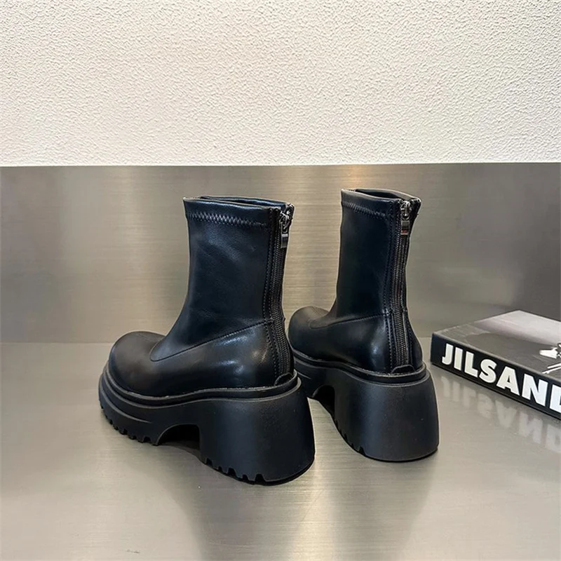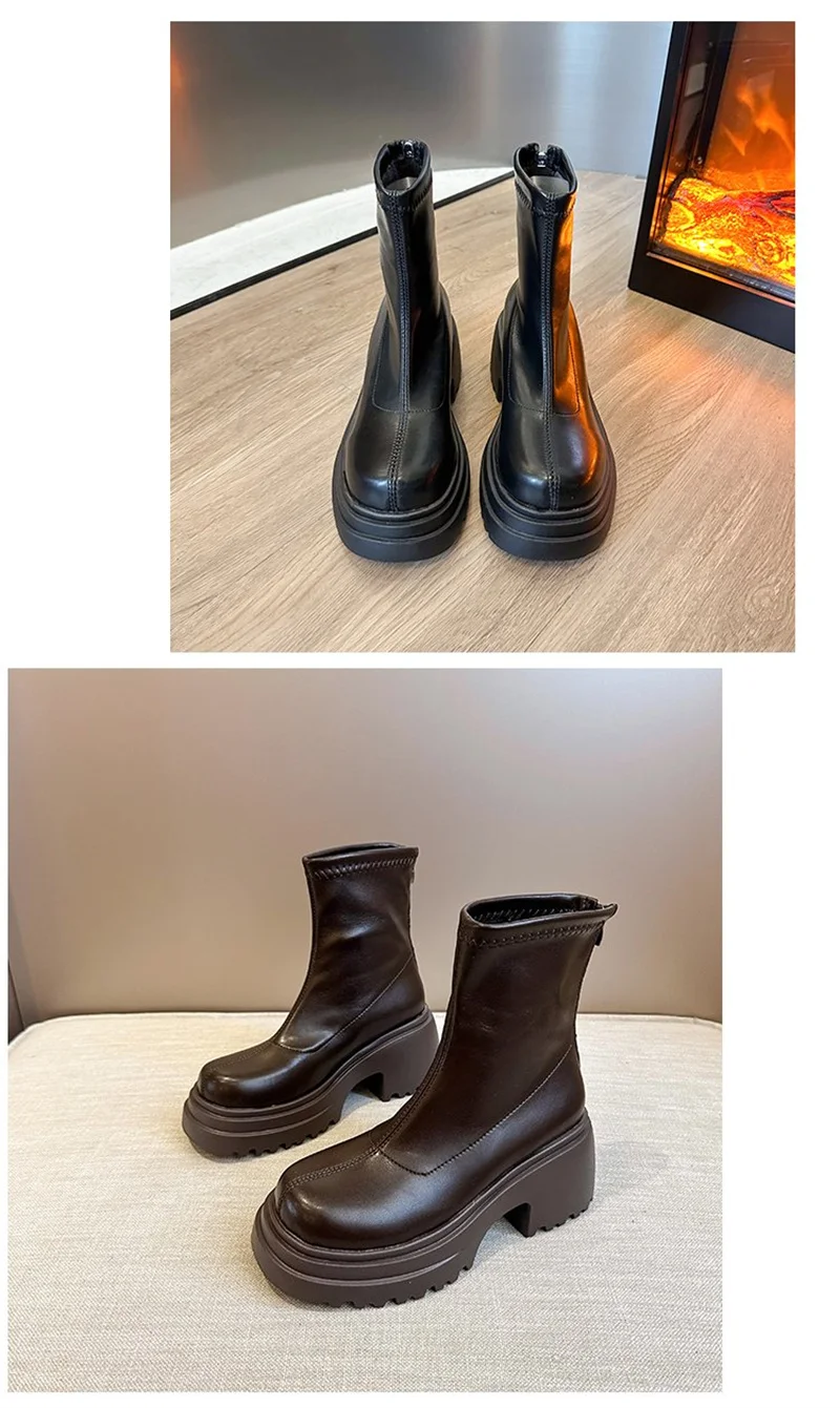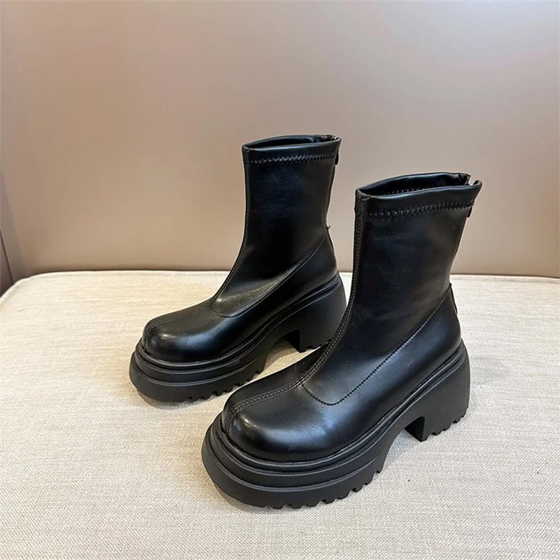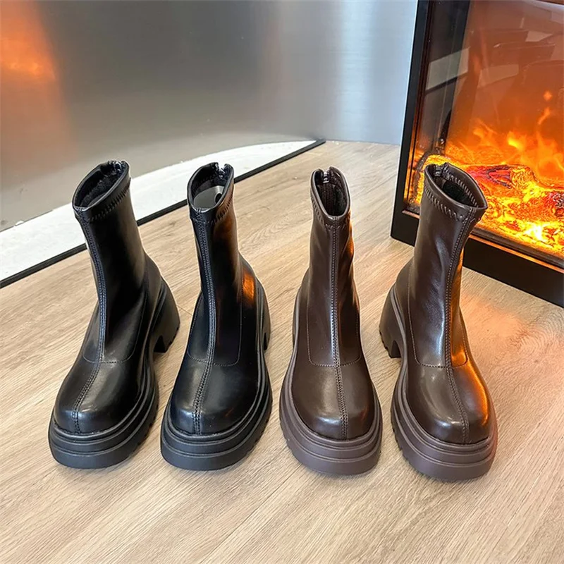 Round toe back zipper thick sole slimming short boots for women’s winter new high thick heel short tube sponge elastic boots