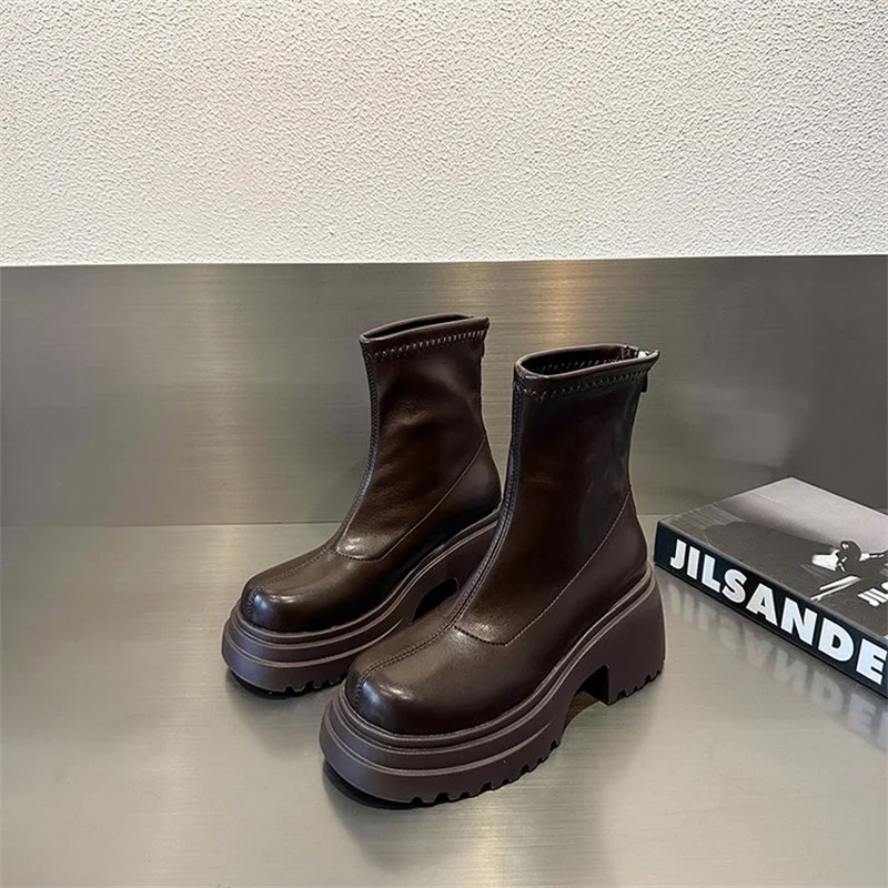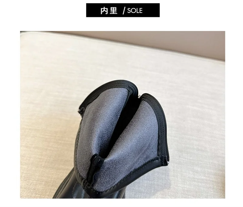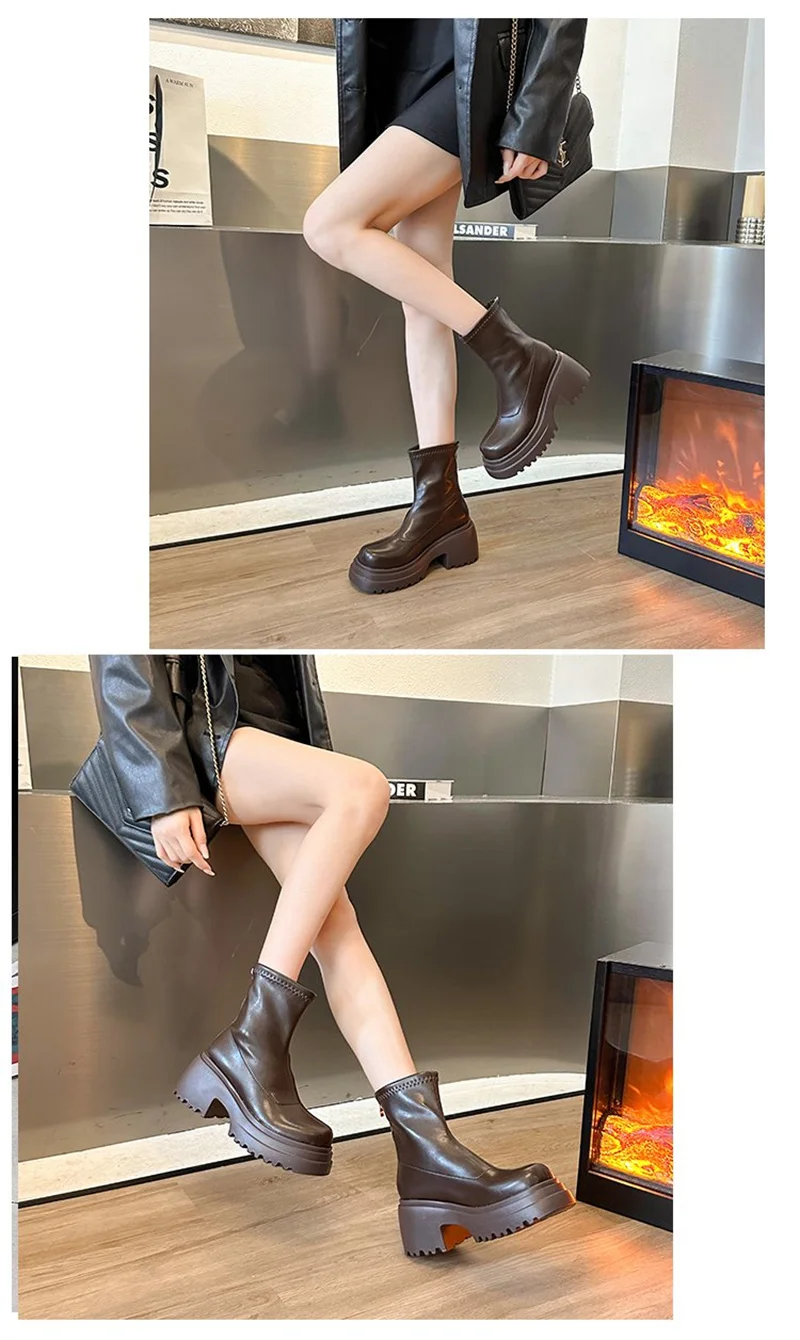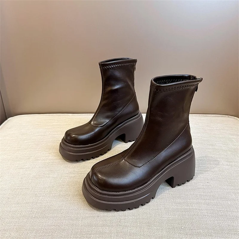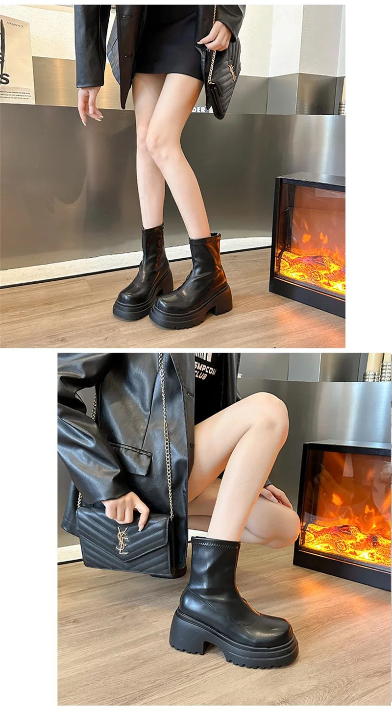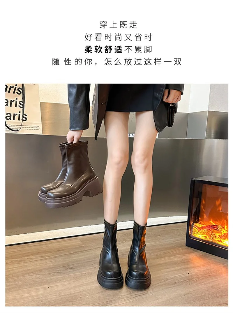 Round toe back zipper thick sole slimming short boots for women’s winter new high thick heel short tube sponge elastic boots