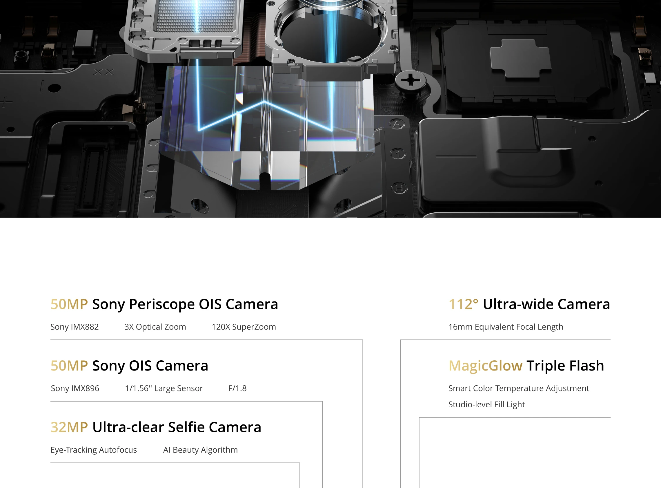 Camera———50MP Sony IMX882 3X Periscope OIS Camera+50MP Sony IMX896 OIS Camera+8MP Sony IMX355 Camera, 32MP Ultra Clear Selfie Camera. (MagicGlow Triple Flash, Underwater Mode, AI Snap mode)