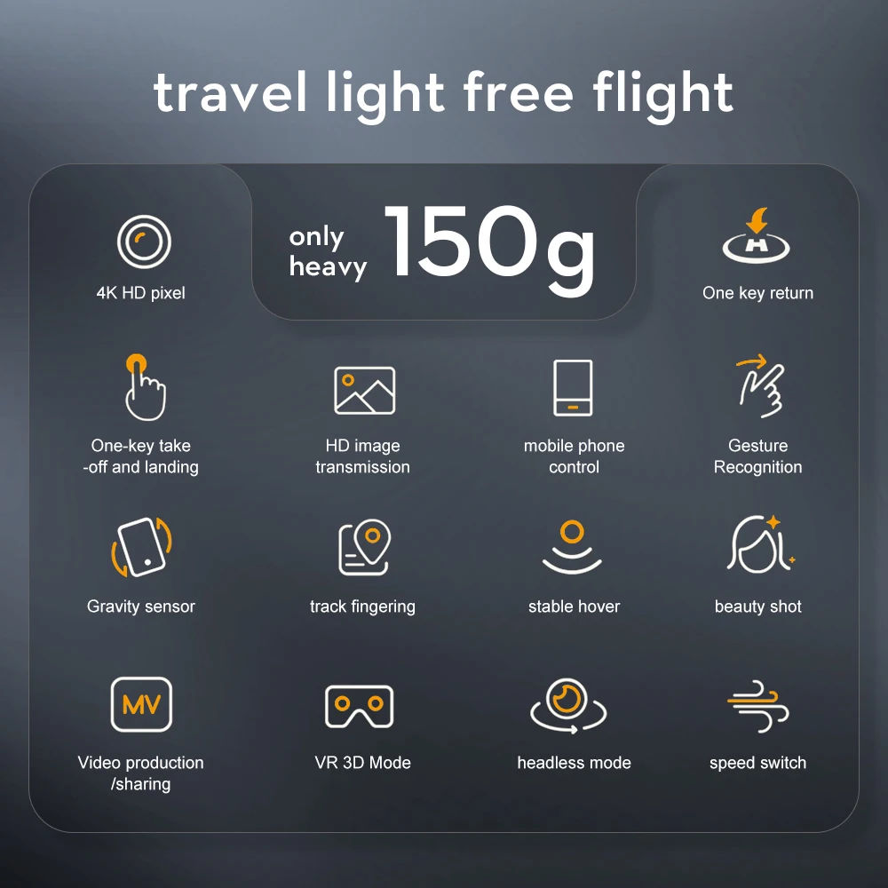 8. The mini size is light in weight, and the fuselage weighs 150g, which can avoid national aviation control (some countries need certification or registration for UAVs over 250g, and 150g can avoid the trouble of certification and registration)
