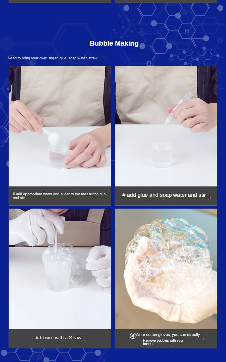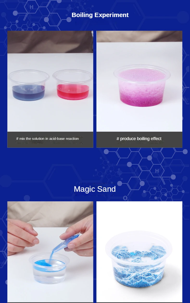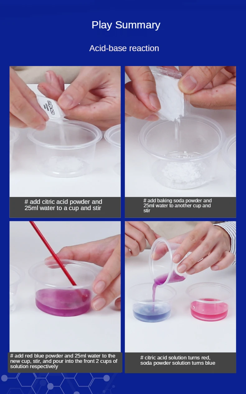 The composition of chemical experiment tools: including: funnel, mirror, dropper, stick, straw, baking soda, citric acid, etc.
