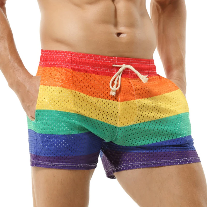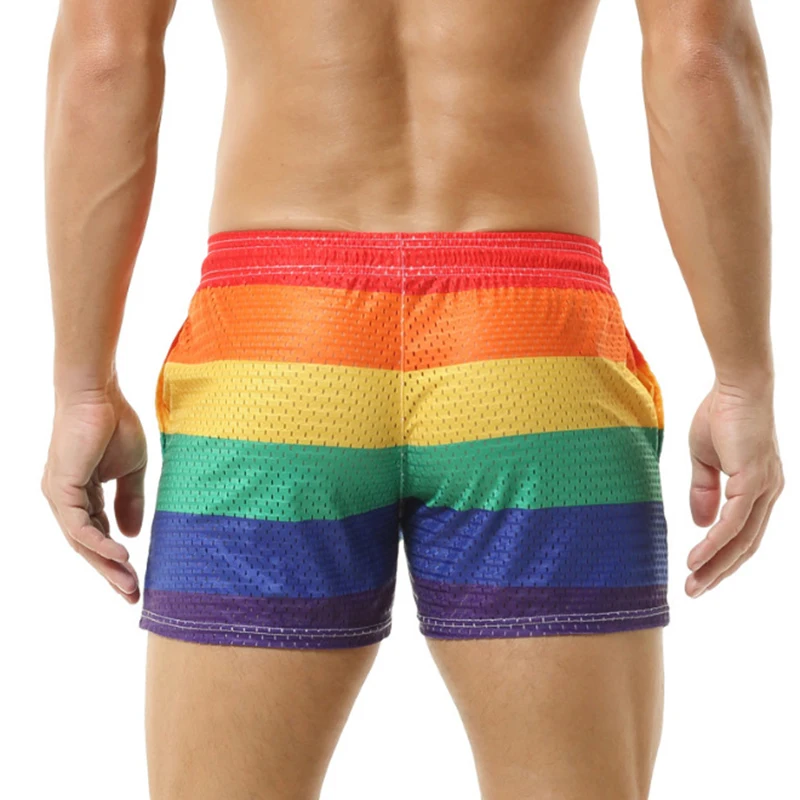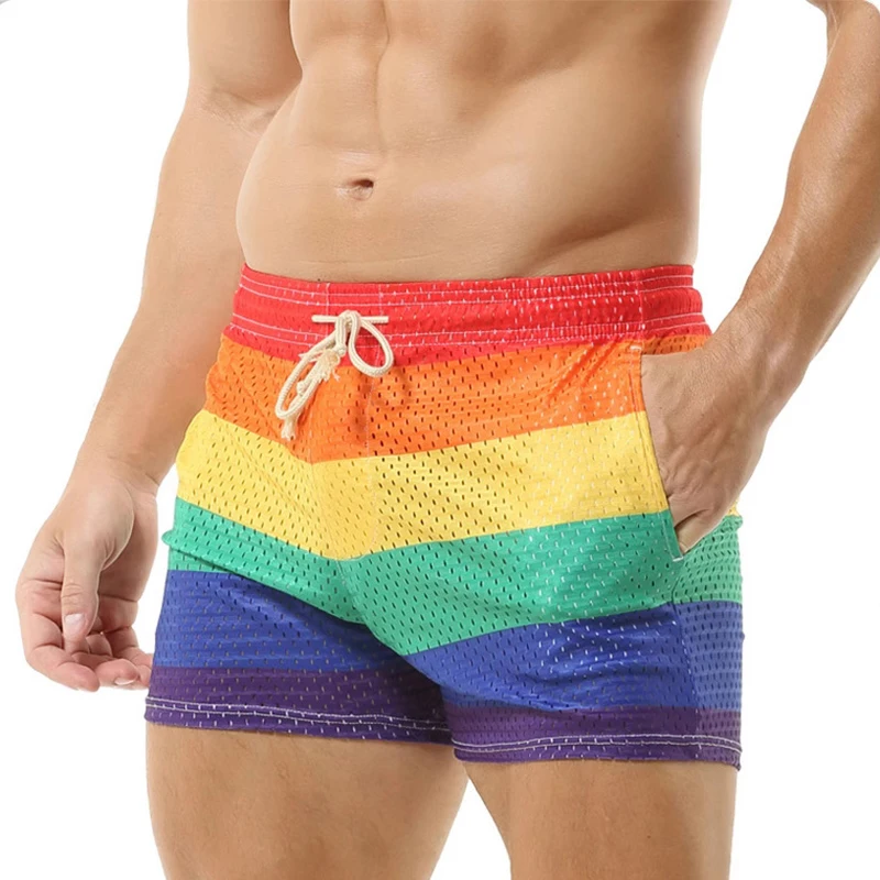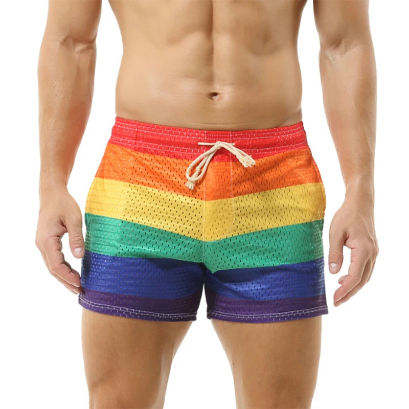 Seaside Beach Vacation Casual Shorts Mens Summer Vintage Striped Rainbow Shorts For Men Leisure Breathable Loose Lace-up Shorts