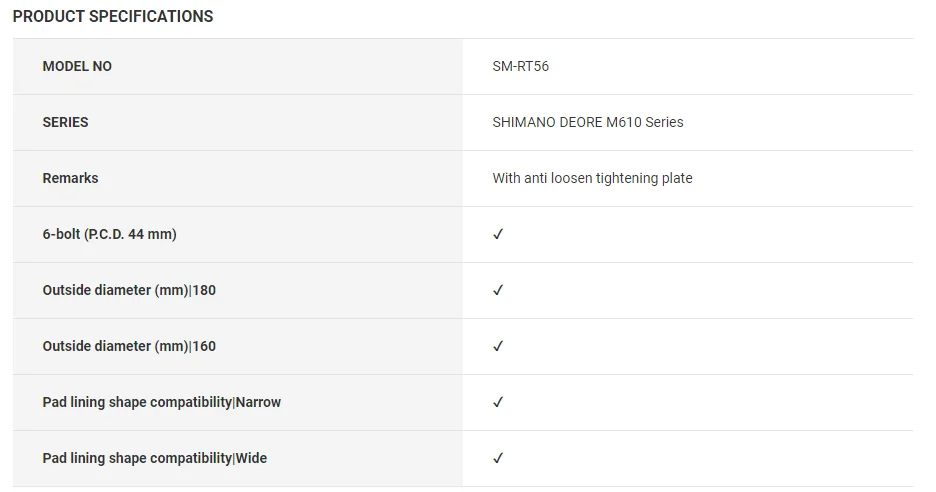 SHIMANO's SM-RT56 6-bolt disc brake rotors deliver consistent stopping power in all riding conditions. A new tightening plate construction makes for quick and secure installation.