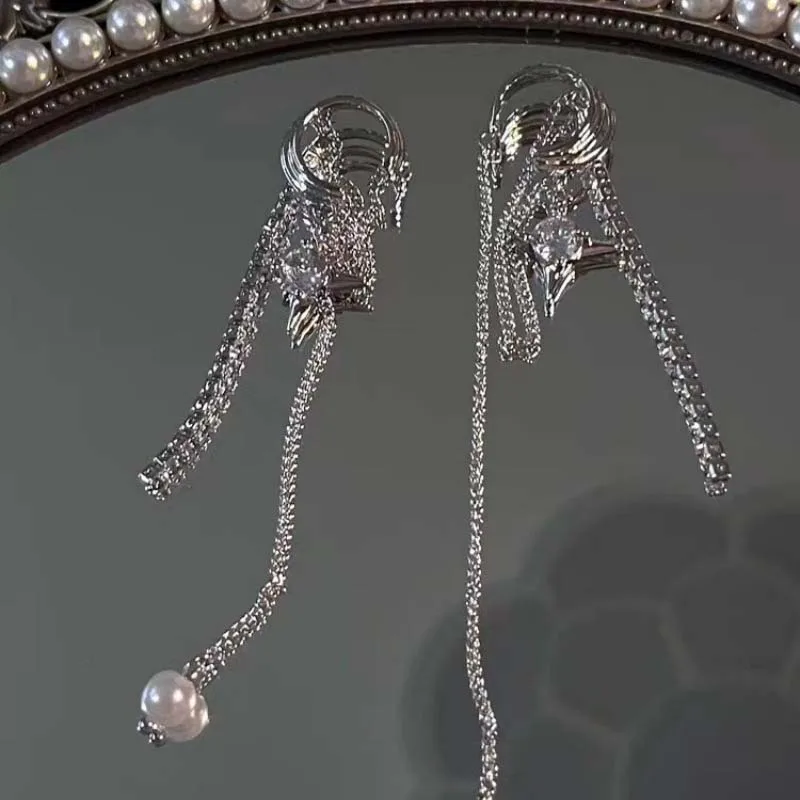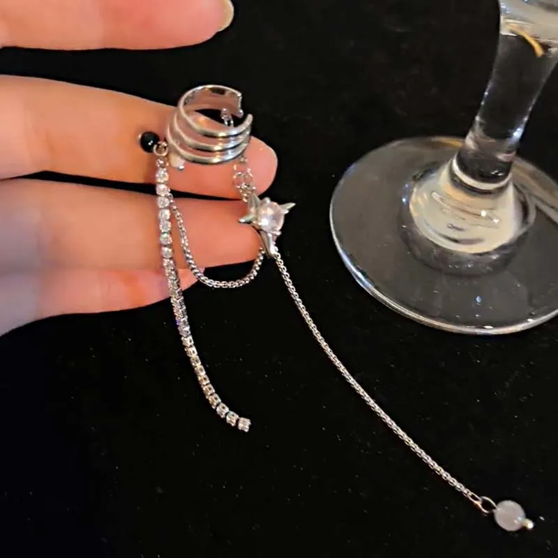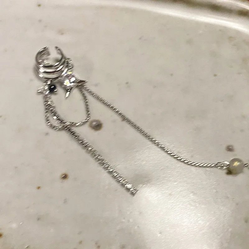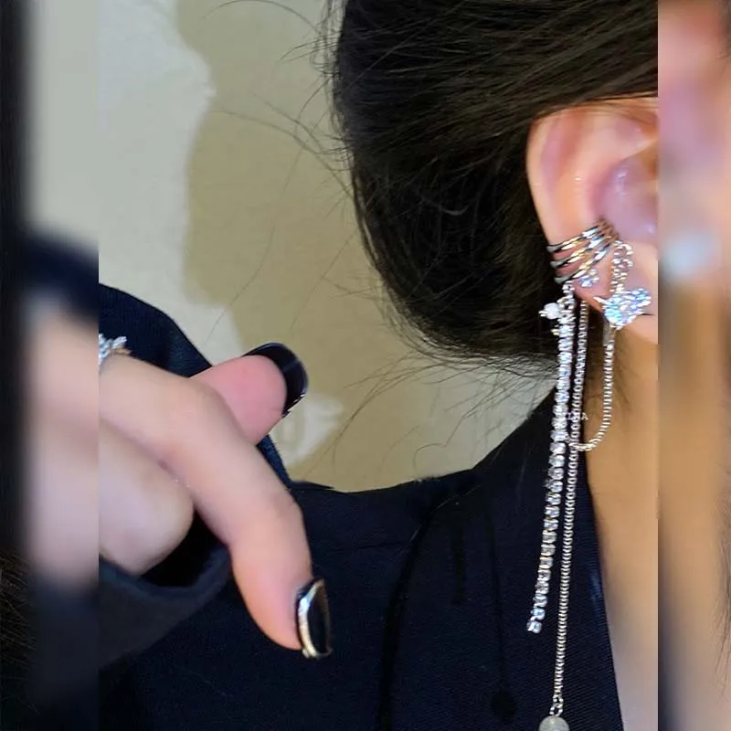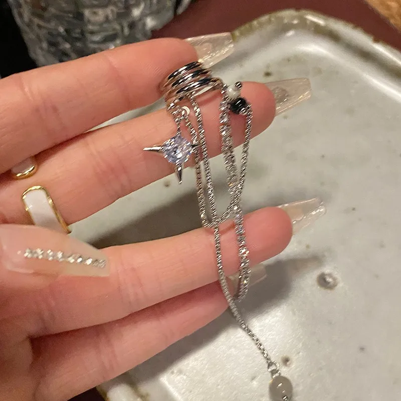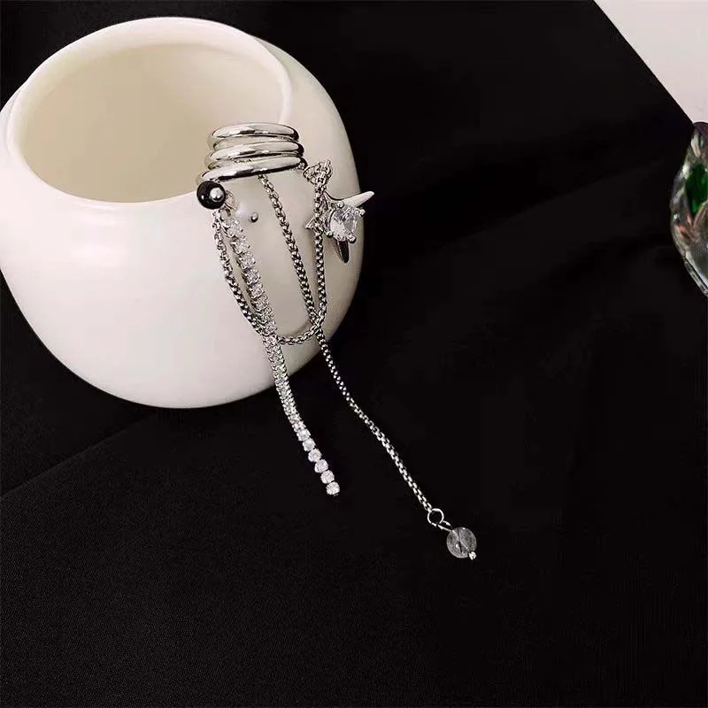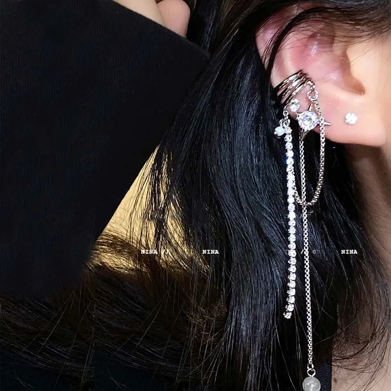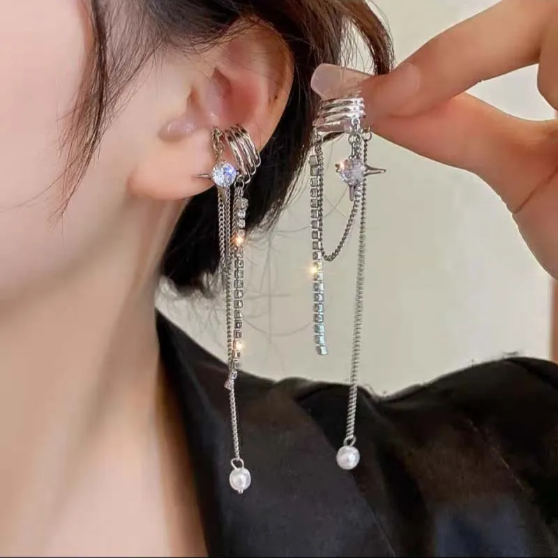 Shining Rhinestone Star Pendant Ear Cuff Faux Earrings for Women Vintage Long Tassel C-Shape Non-Piercing Fake Cartilage Jewelry