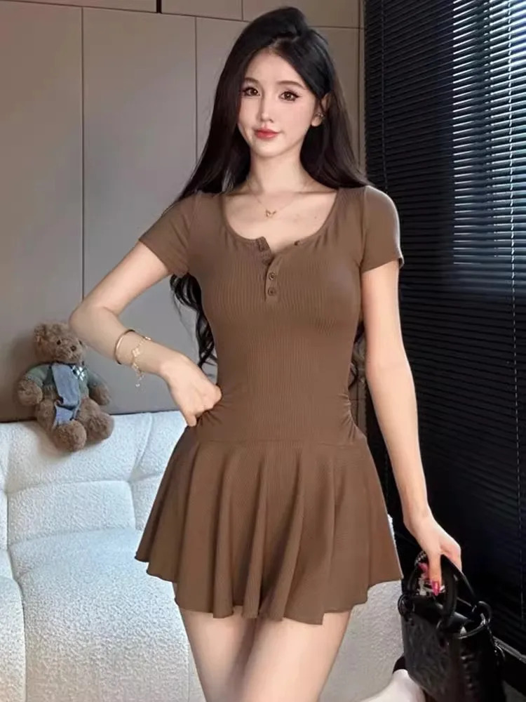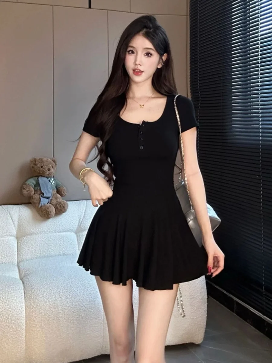 Short Sleeve Mini Dresses Women Summer Spicy Girls Slimming Pleated Single Breasted Trendy Fashion Ulzzang Casual Daily Female