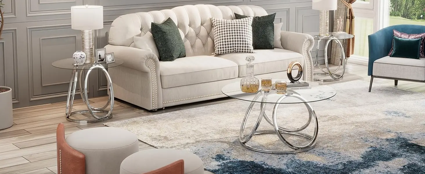 Silver Coffee Table, Modern Glass Coffee Table Living Room Table with Ring-Shaped Frames, Glass Coffee Table