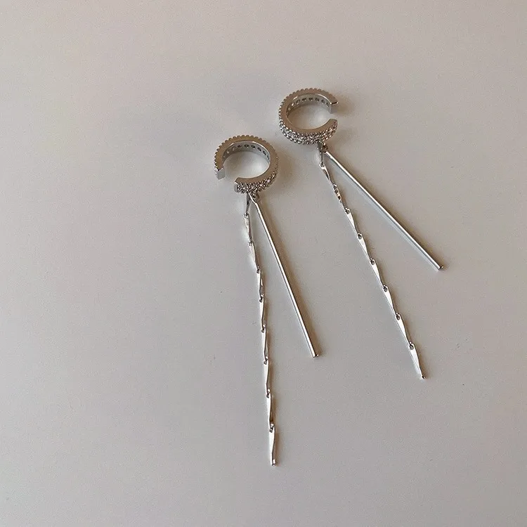 Silver Color Crystal Shining C Shape Long Tassel Ear Cuff No Piercing Earrings Female Design Simple Ear Clip Party Jewelry