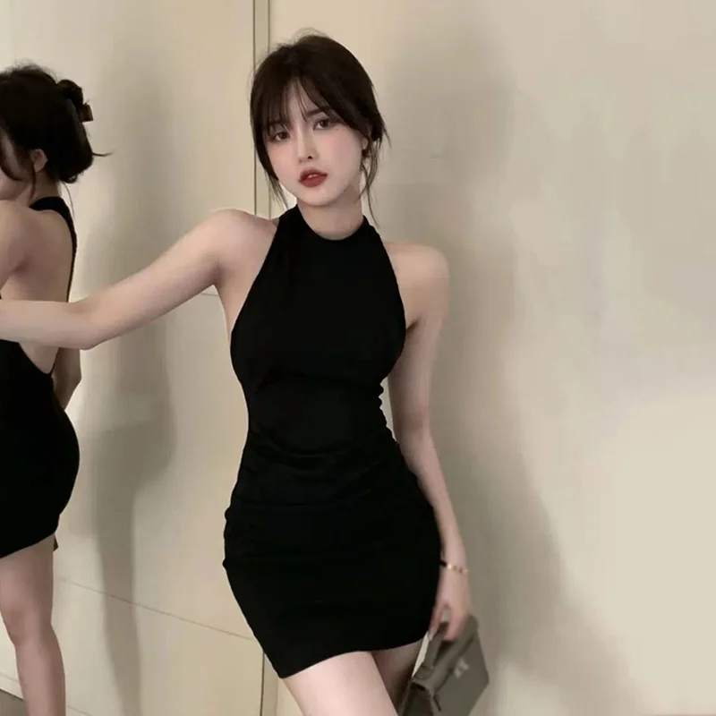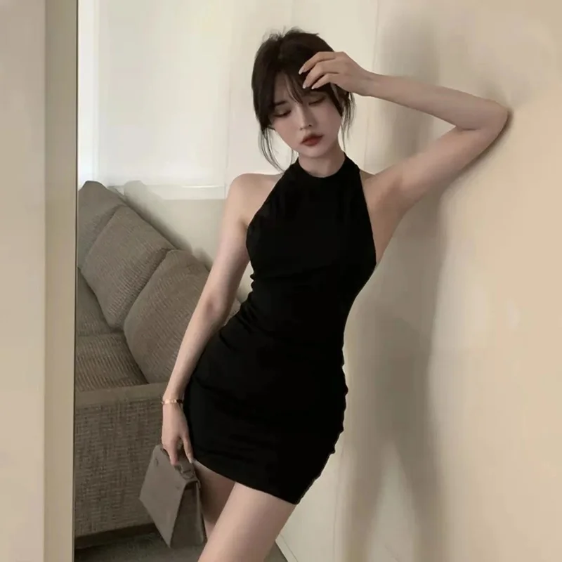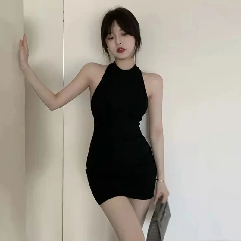 Slim Fitting Dress Black Backless Tank Top Dress Summer Buttocks Wrapped Sexy Hanging Neck Short Dresses Korean Style Fashion